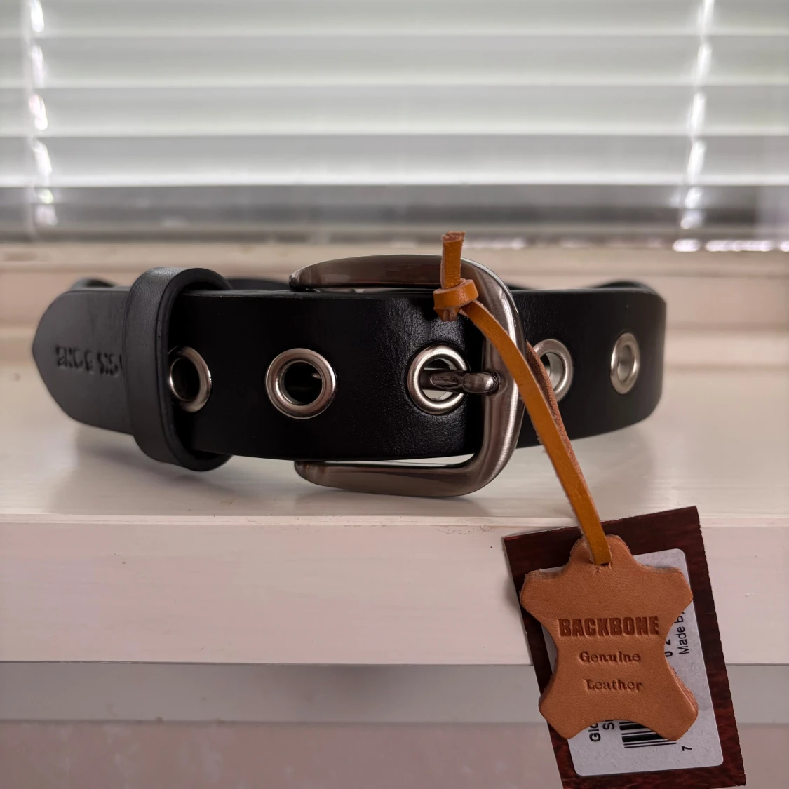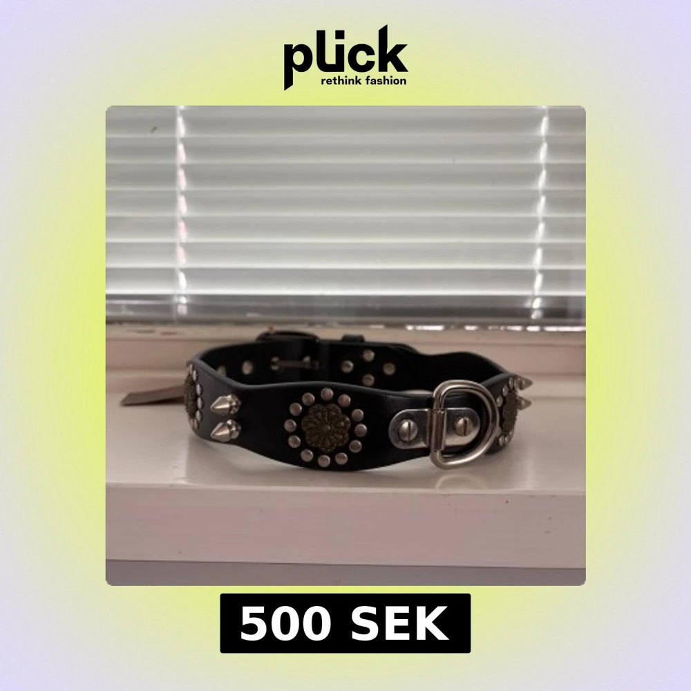 Säljer ett svart hundhalsband i äkta skinn från BACKBONE. Halsbandet har coola silverfärgade nitar, stora öglor och detaljerade metallplattor med mönster. Spännet är robust i metall. Helt nytt, lappen sitter kvar. 60CM NYPRIS 705kr
