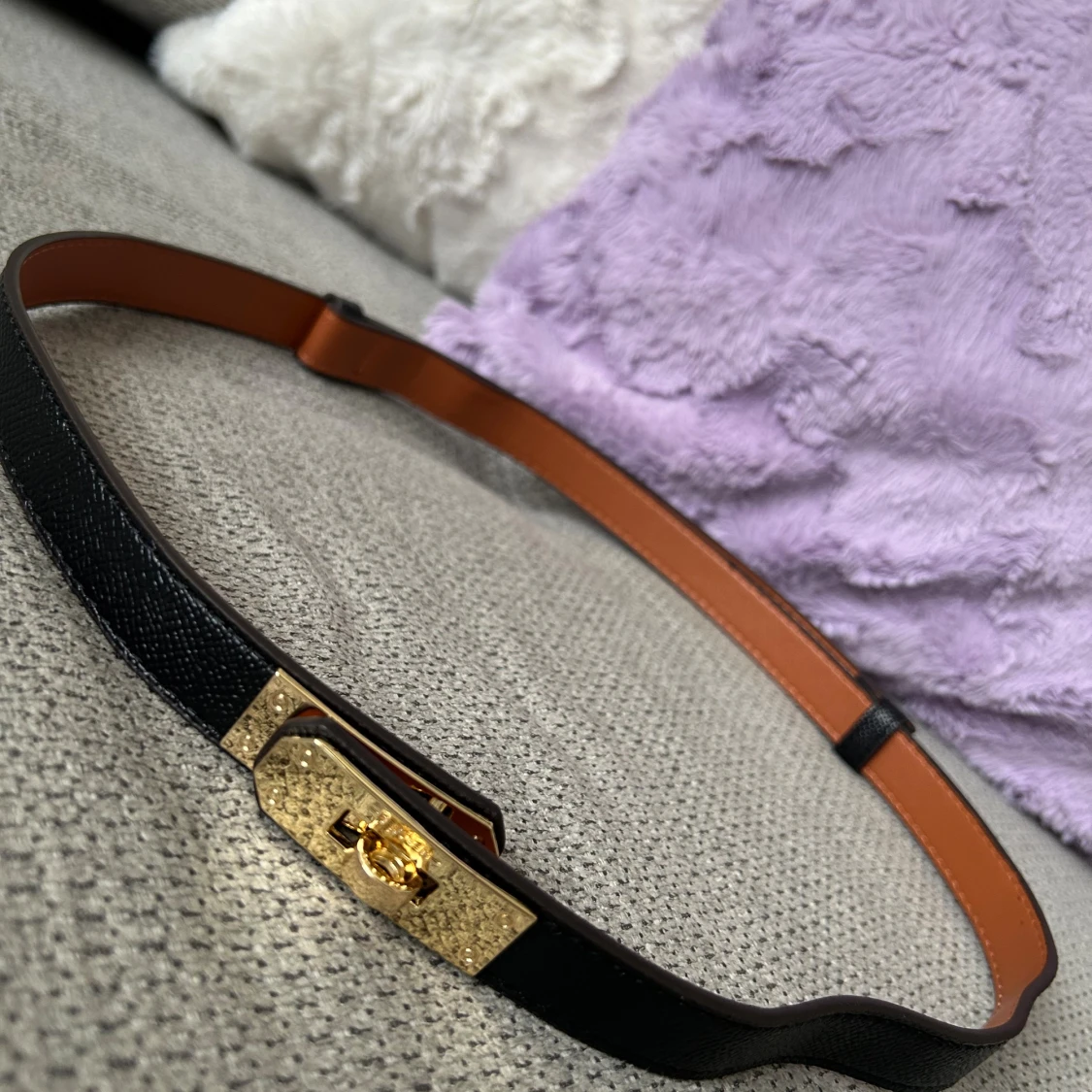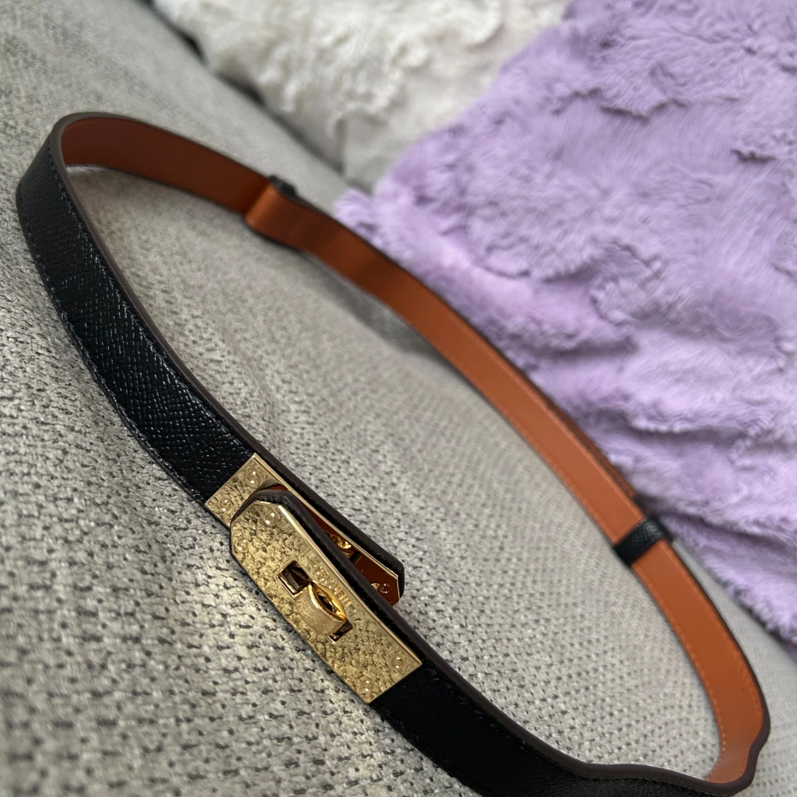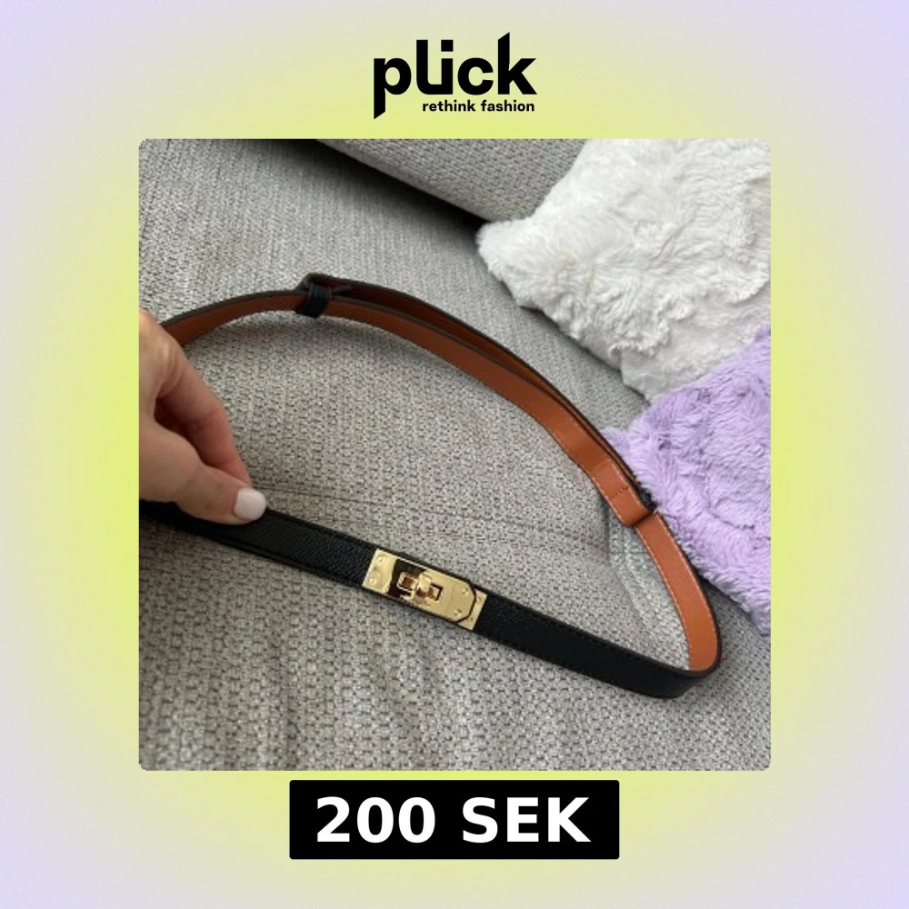 Snyggt och stilrent svart bälte i skinn med smal design och exklusivt guldfärgat spänne framtill. Insidan är brun och bältet har en elegant struktur på ytan. Perfekt accessoar för att lyfta din outfit med en lyxig touch.