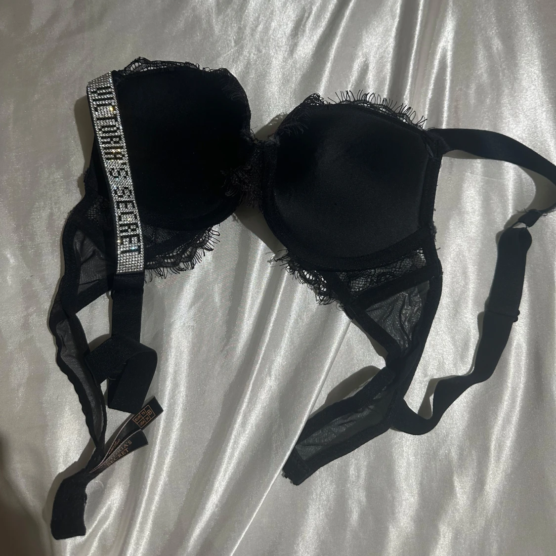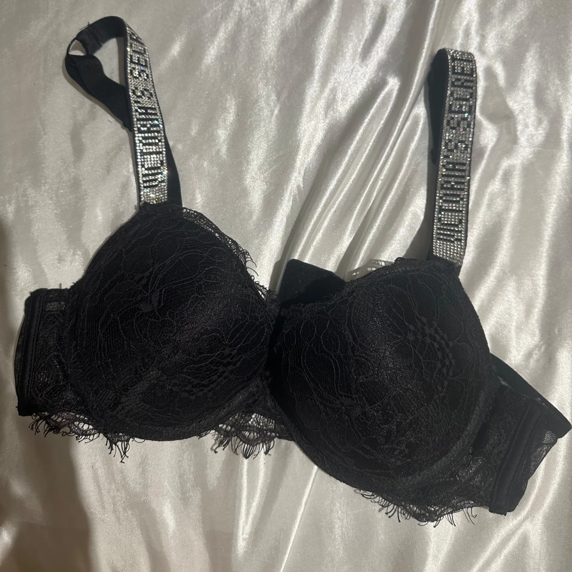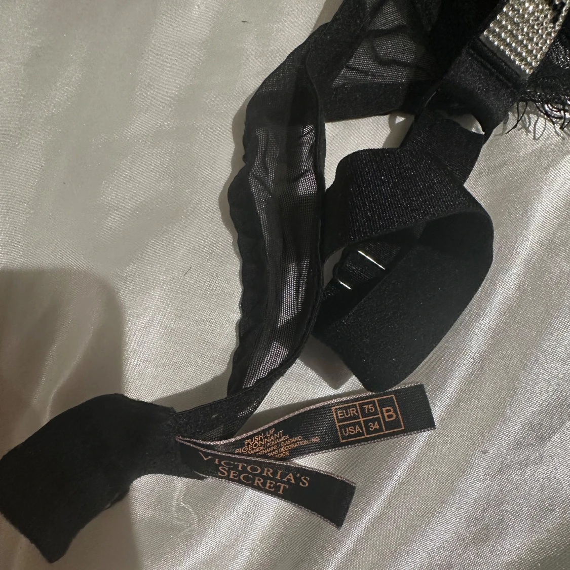 Eftertraktad snygg BH från Victoria’s secret i svart med spetsdetaljer och justerbara axelband i strass med logotyp. Perfekt för en elegant look. Endast använd fåtal gånger Nypris 1250 kr