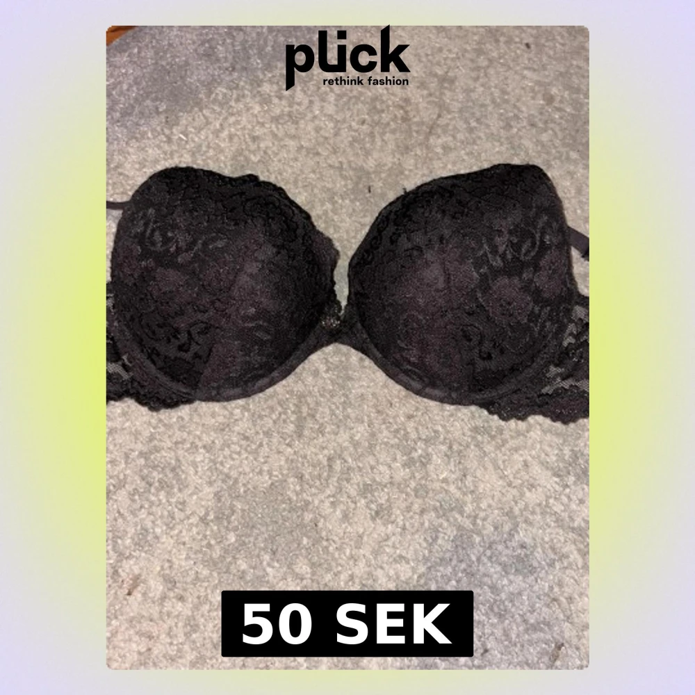 Svart bh med snygg spetsmönstrad framsida och slät insida. Kuporna är formade och ger bra stöd, medan spetsen på sidorna ger en extra touch. Har använt den max två gånger. Men är så klart nytvättad