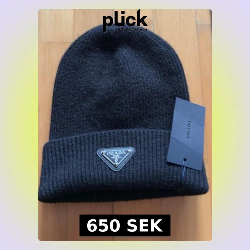 Snygg svart mössa från Prada med klassisk ribbstickad design och uppvikt kant. Mössan har en ikonisk metallbricka med Prada-logga framtill och en etikett på insidan. Perfekt för dig som vill ha en stilren accessoar med lyxig känsla.