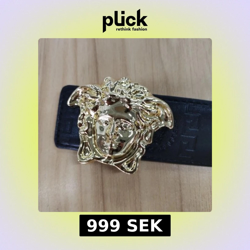 Snyggt svart bälte från Versace med ikoniskt guldigt Medusa-huvud som spänne. Bältet är gjort i präglat skinn med diskret mönster längs hela remmen. Perfekt för dig som vill sticka ut med en lyxig detalj i outfiten.