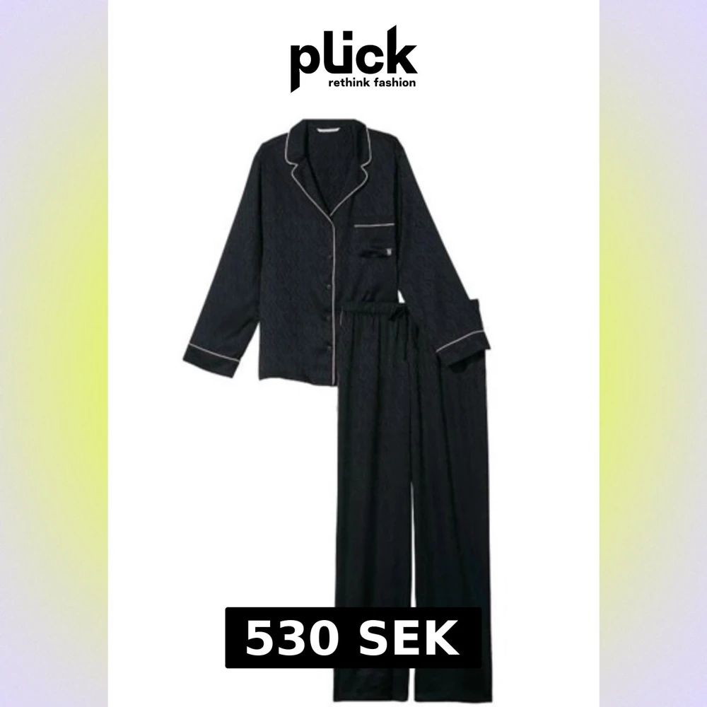 Super snyggt svart pyjamasset från Victoria's Secret i storlek M💗 Har ett diskret mönster med VS-logga, rak passform och elastisk midja för extra komfort. Materialet är glansigt satin i mycket bra skick. Nästan aldrig använd då den är för stor🙏