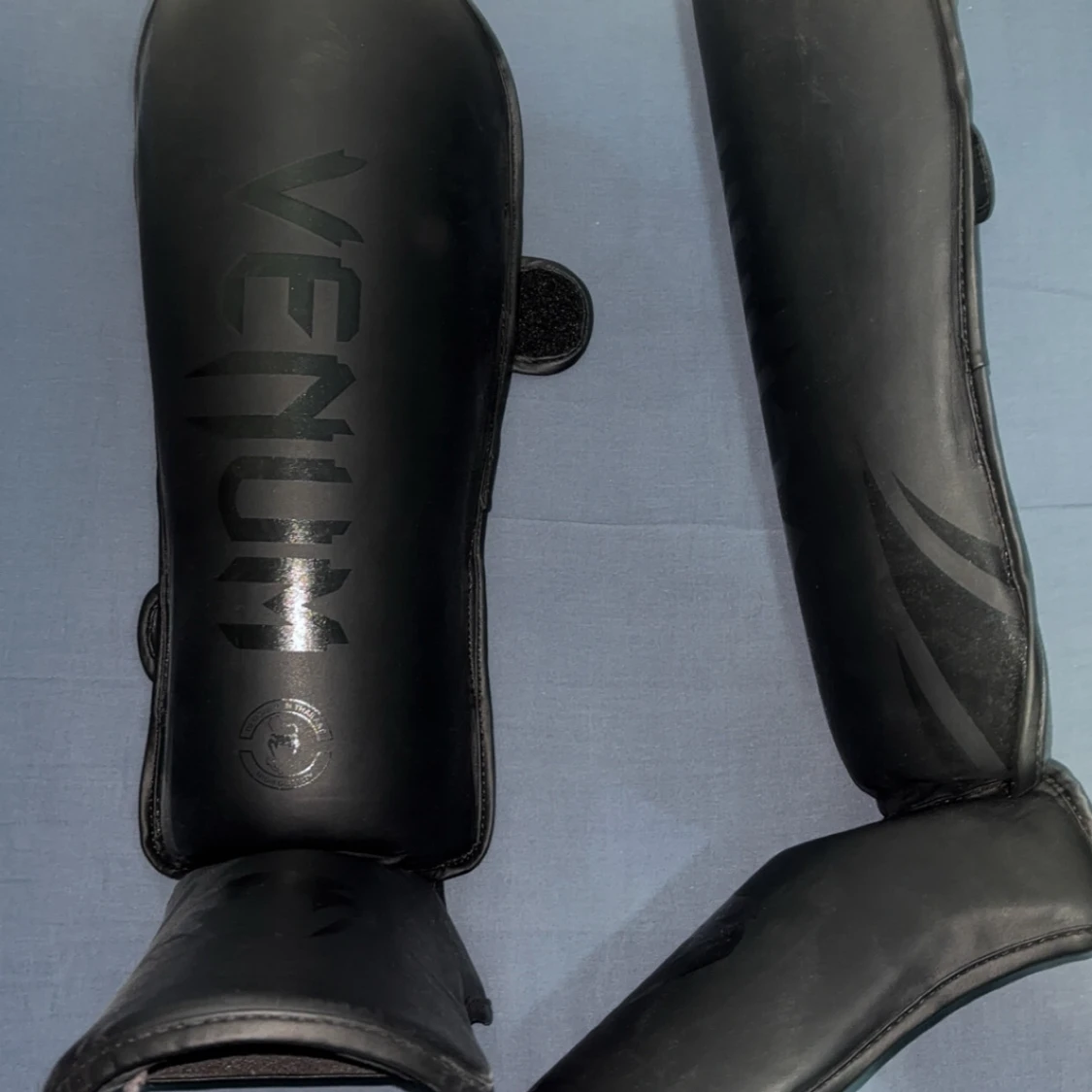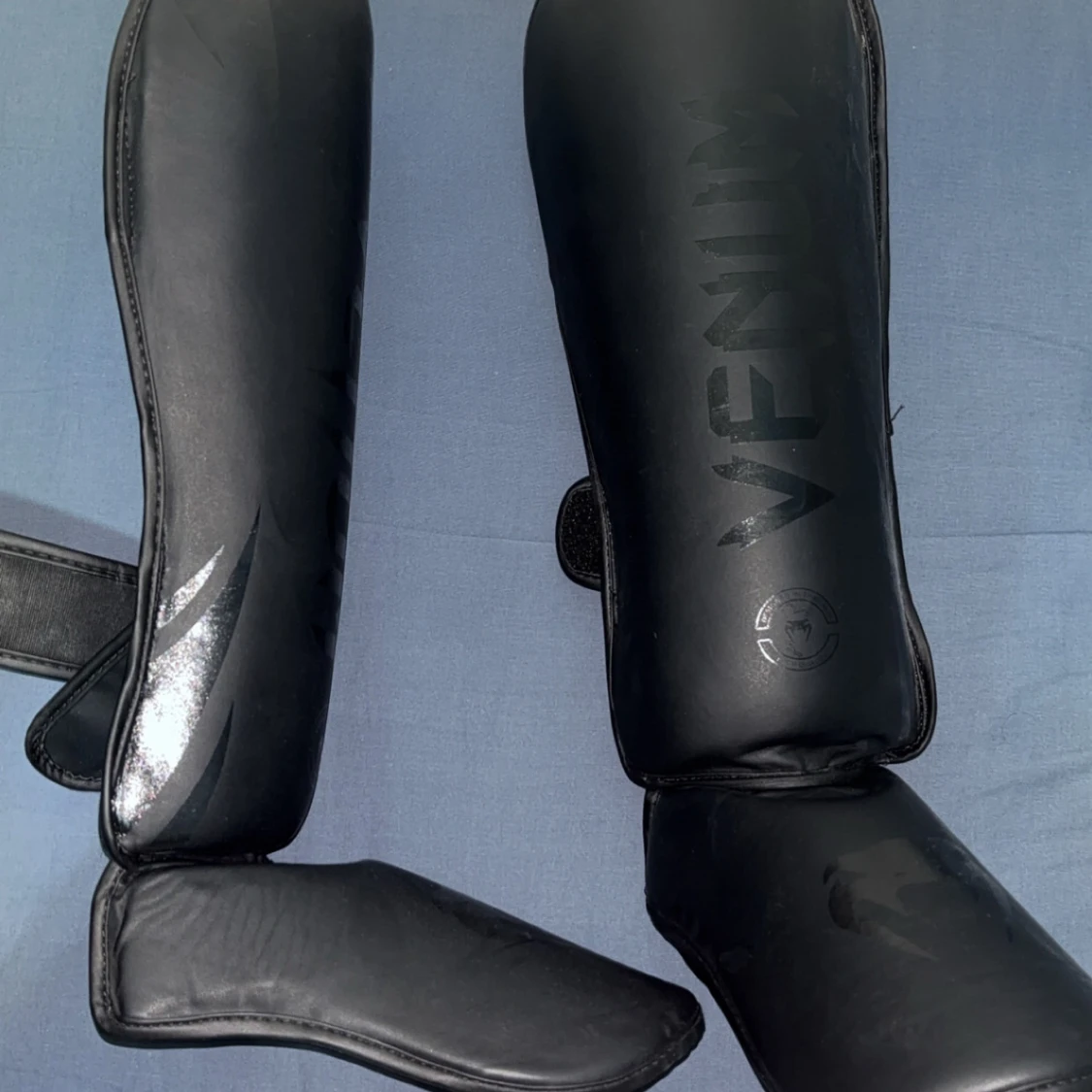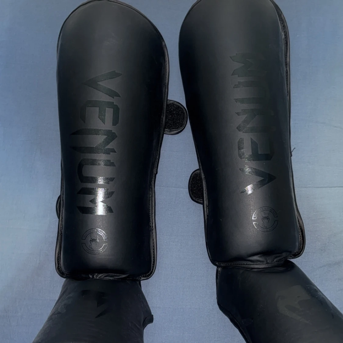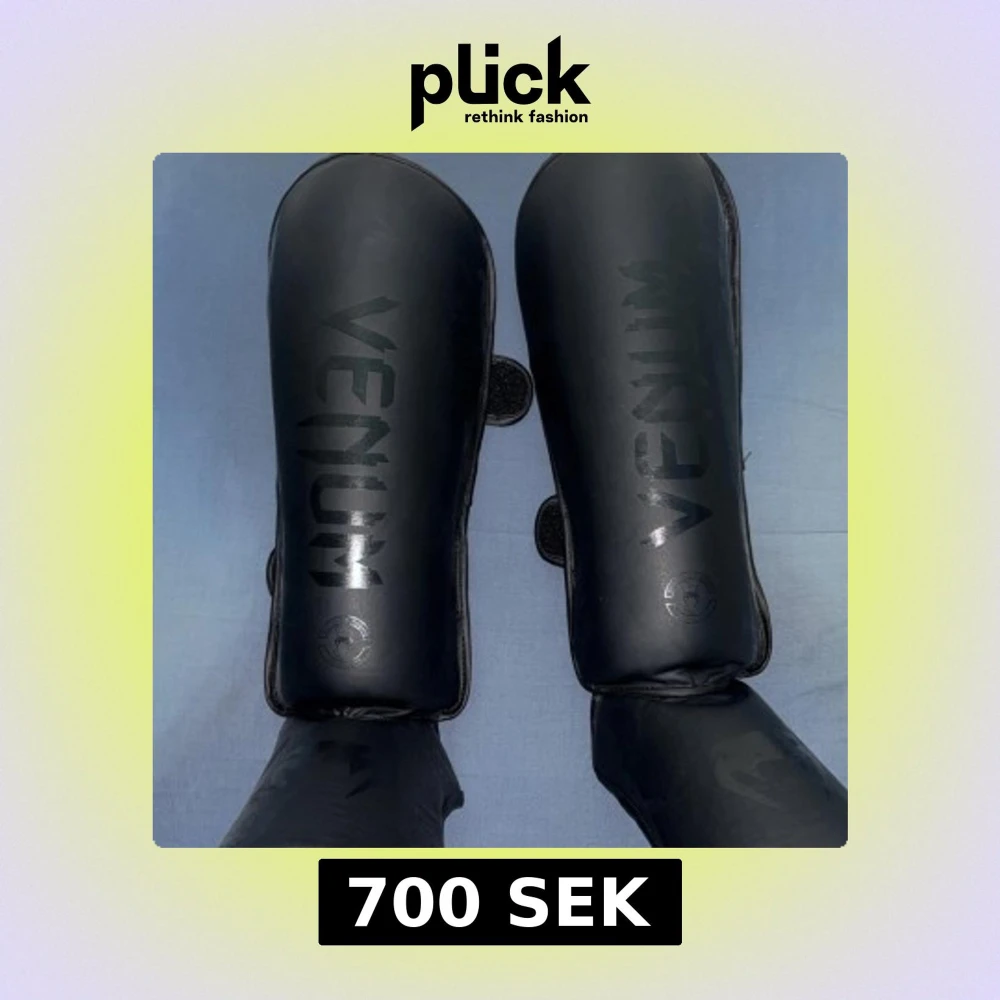 Säljer ett par svarta benskydd från Venum med stilren design och diskret logga. De är tillverkade i syntetmaterial och har kardborreband för enkel justering. Perfekta för dig som tränar kampsport och vill ha bra skydd för smalbenen.