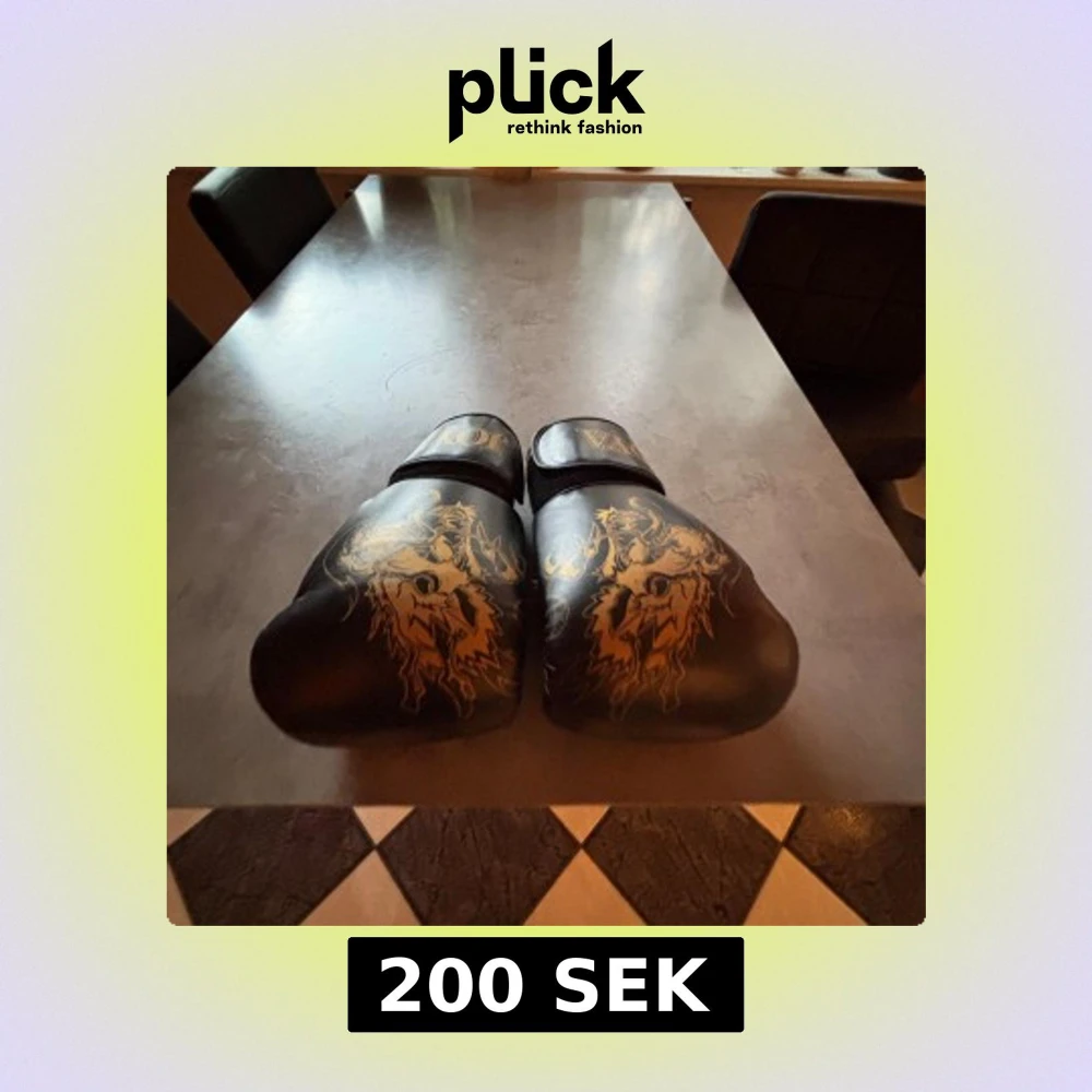 Säljer ett par svarta boxningshandskar från Joya med snyggt guldigt drakmotiv på ovansidan. Handskarna har bred kardborrestängning och är tillverkade i syntetmaterial. Perfekta för dig som vill sticka ut på träningen!