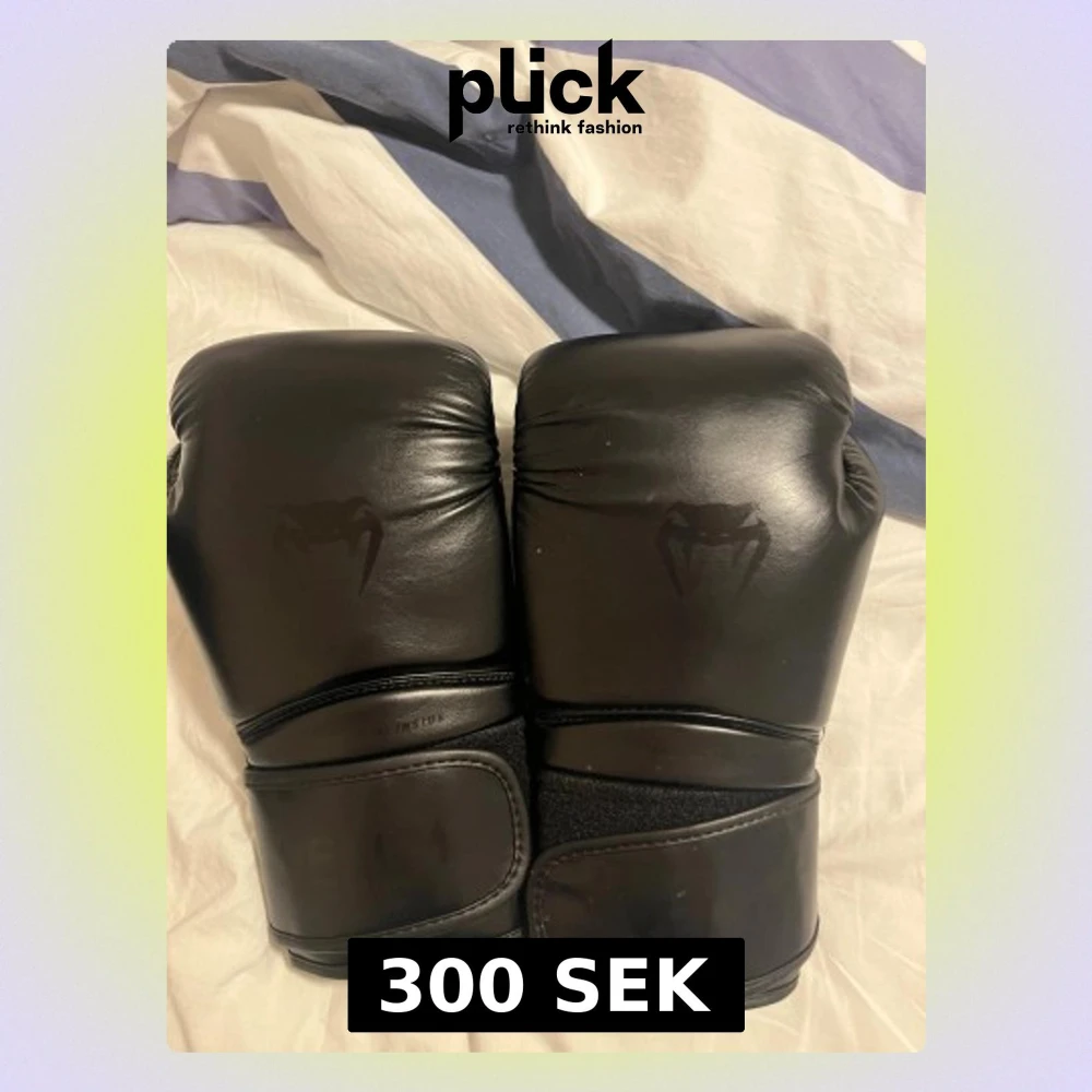 Säljer ett par svarta boxningshandskar från Venum med coolt logotryck på ovansidan. Handskarna har en rundad form, bred kardborreknäppning och är tillverkade i syntetmaterial med slät finish. Perfekta för träning och sparring.