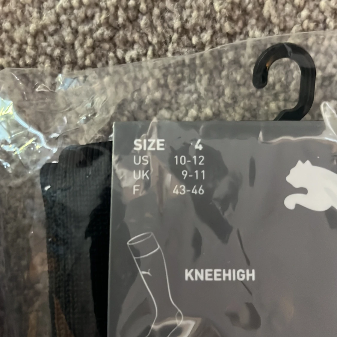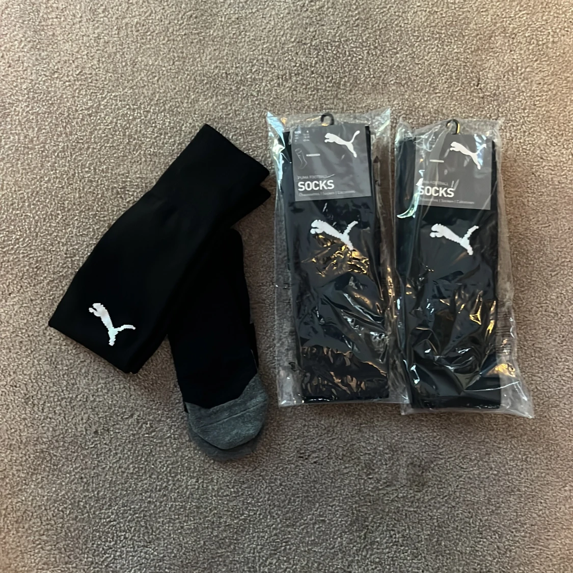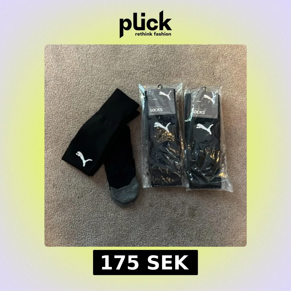 Säljer ett 3-pack svarta knästrumpor från Puma i storlek 43-46. Strumporna har en vit Puma-logga på sidan och grå tåparti. Perfekta för träning eller sport, sitter skönt och har klassisk stil.