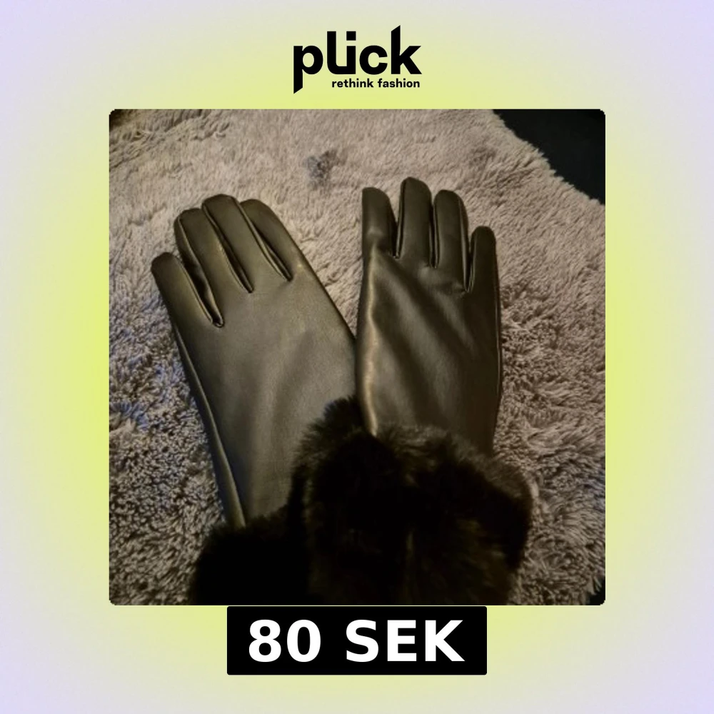 Snygga svarta handskar med mjuk och fluffig pälsdetalj vid handleden. Handskarna har en stilren och klassisk design med slät yta och fem fingrar. Perfekta för kalla dagar när du vill hålla händerna varma och samtidigt se cool ut.