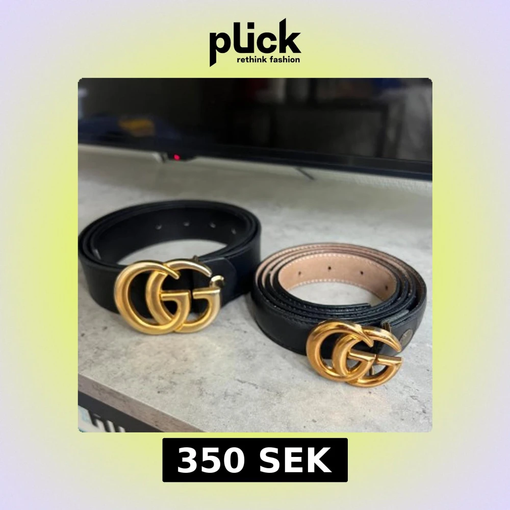 Säljer två svarta bälten i läder med ikoniskt dubbelt GG-spänne i guldfärg. Bältet är gjort i slätt skinn och har klassisk design med flera hål för justering. Perfekt accessoar för att lyfta din outfit med en lyxig touch. Det större bältet är i mycket bra skick, och det mindre är i bra skick men har lite skrapor på loggan. Priset är för båda ihop.