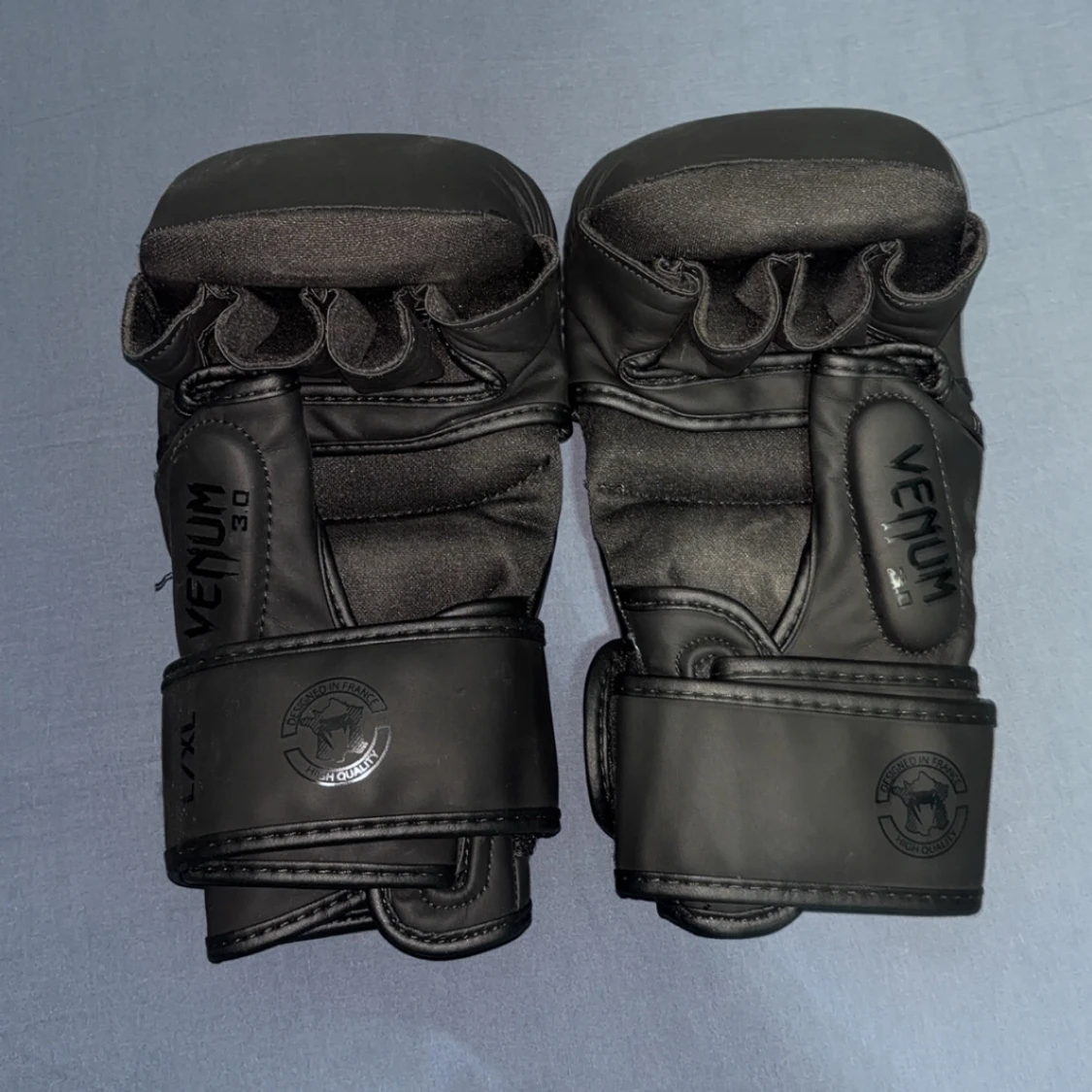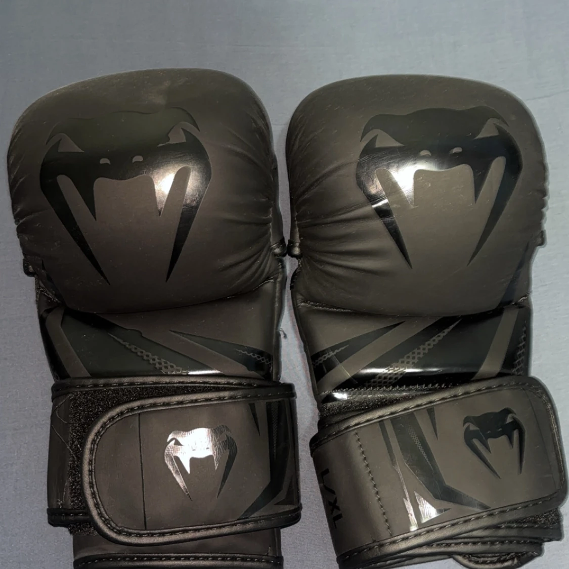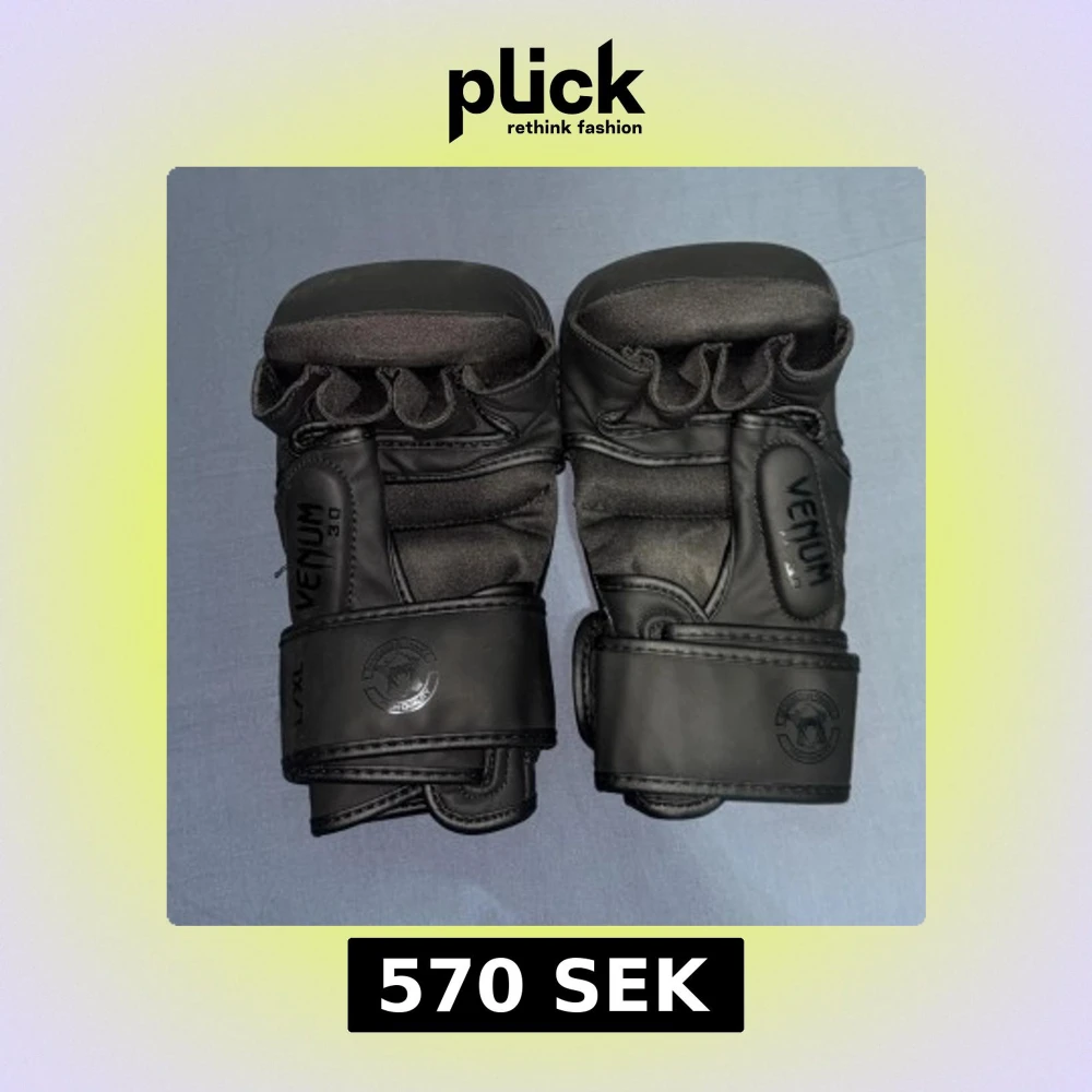 Säljer ett par svarta MMA-handskar från Venum 3.0 med coolt ormmönster på ovansidan och breda kardborreband för extra stöd. Handskarna är tillverkade i syntetmaterial och har öppen design för fingrarna, perfekt för träning och kampsport.