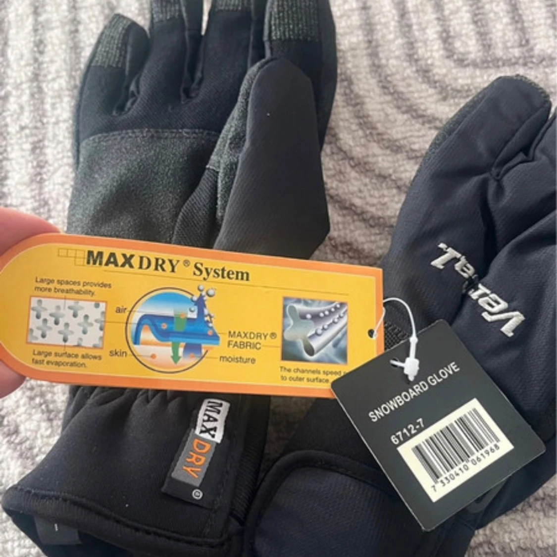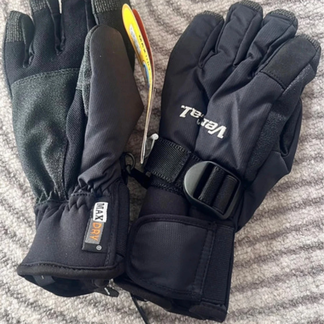 Svarta snowboardhandskar från Vert-Caz med MaxDry-system för extra andningsförmåga. Handskarna har justerbart spänne vid handleden, förstärkta fingertoppar och breda muddar. Perfekta för vinterns äventyr i backen.