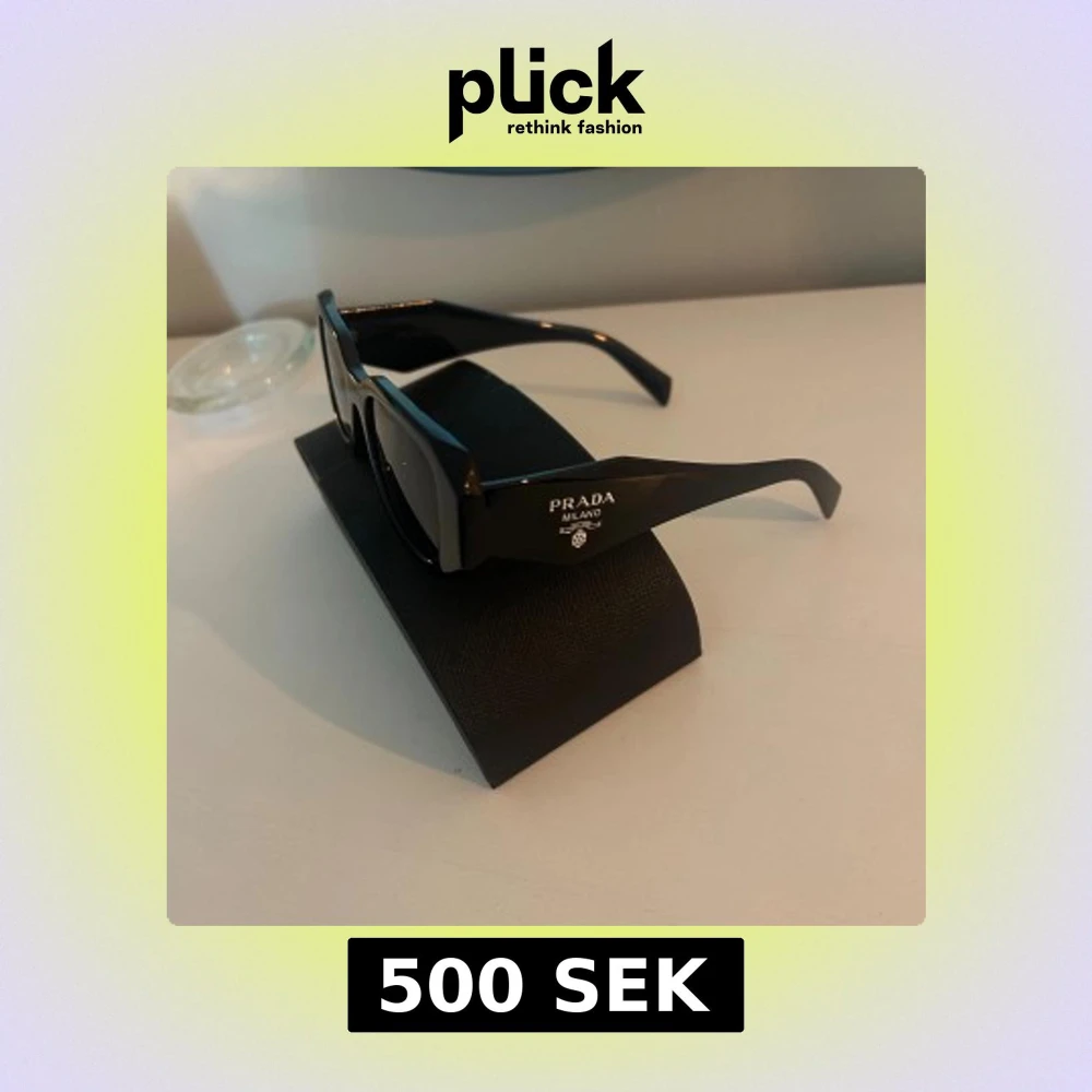 Snygga svarta solglasögon från Prada med rektangulära bågar och tydlig logga på sidorna. Glasögonen har en chunky design och kommer med tillhörande svart fodral. Perfekta för dig som vill ha en stilren och lyxig accessoar.