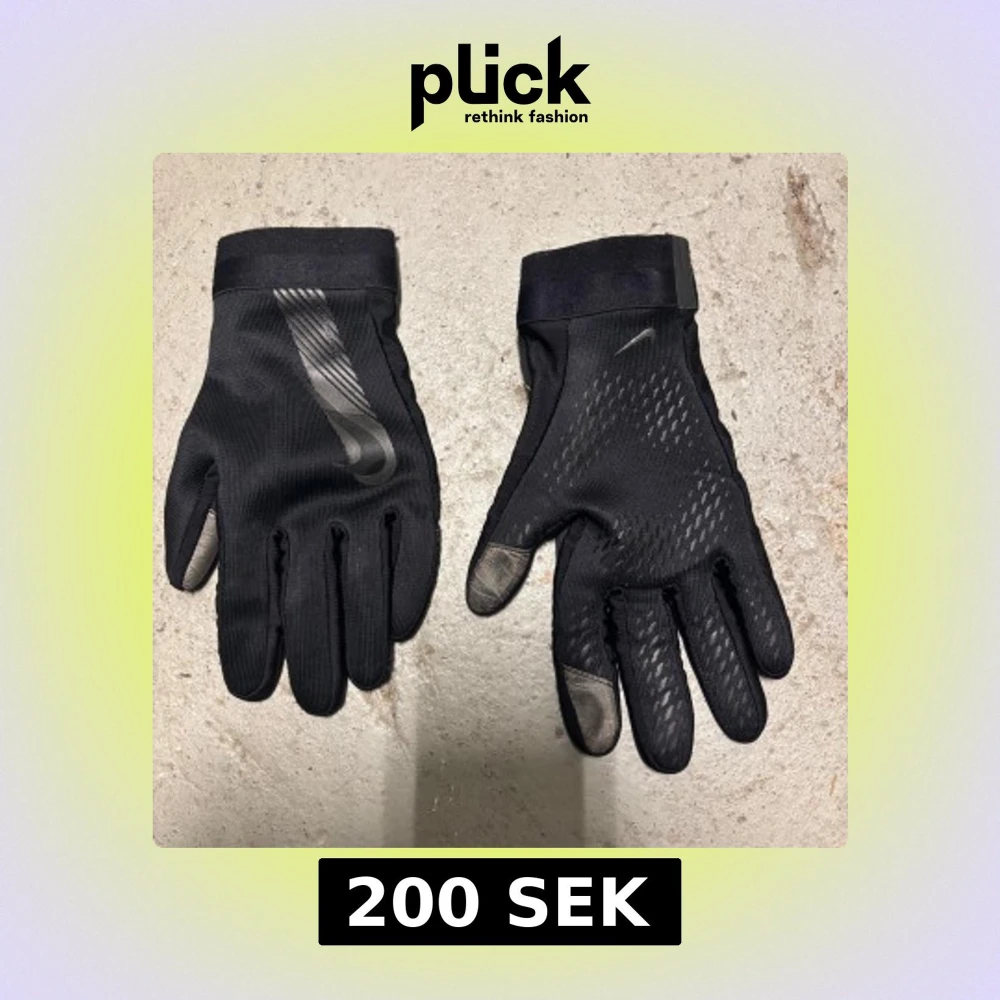 Svarta handskar från Nike med diskret mönster och logga på ovansidan. Handskarna har förstärkta fingertoppar och greppvänligt material i handflatan. Perfekta för träning utomhus under kyligare dagar.