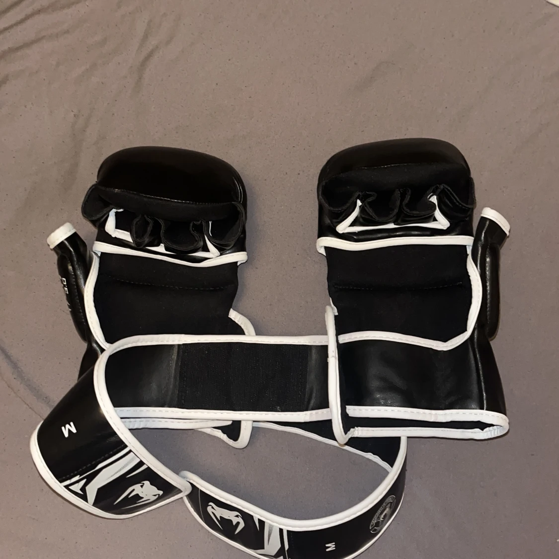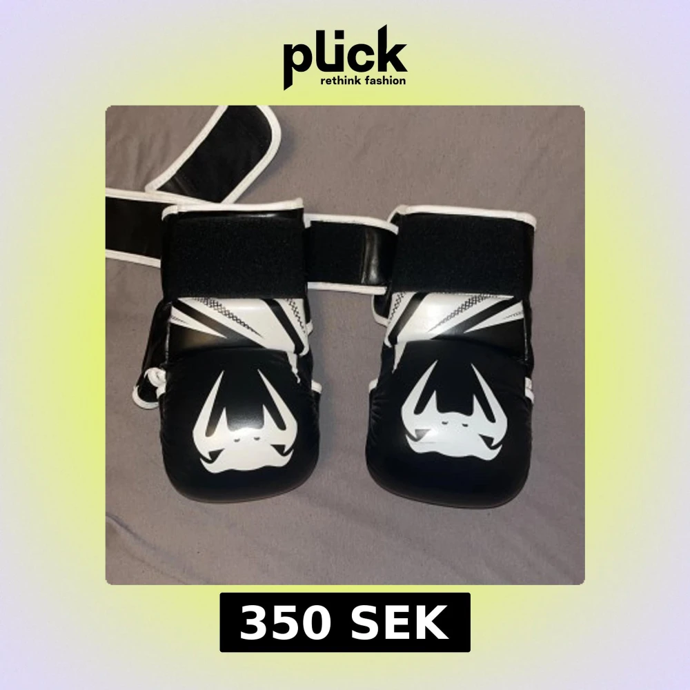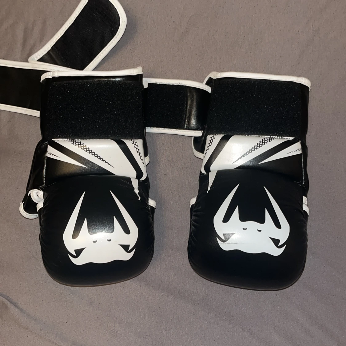 Säljer ett par svarta och vita boxningshandskar från Venom i storlek M. Handskarna har coolt grafiskt tryck med Venom-loggan och breda kardborreband för extra stöd. Materialet är syntetiskt och designen är riktigt sportig med vita detaljer och kontraster. Pris går att diskutera