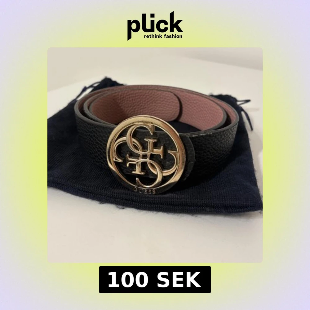 Snyggt svart bälte från Guess med ett stort, rundat guldspänne med logotyp. Tygpåse medföljer. Meddela för fler bilder.