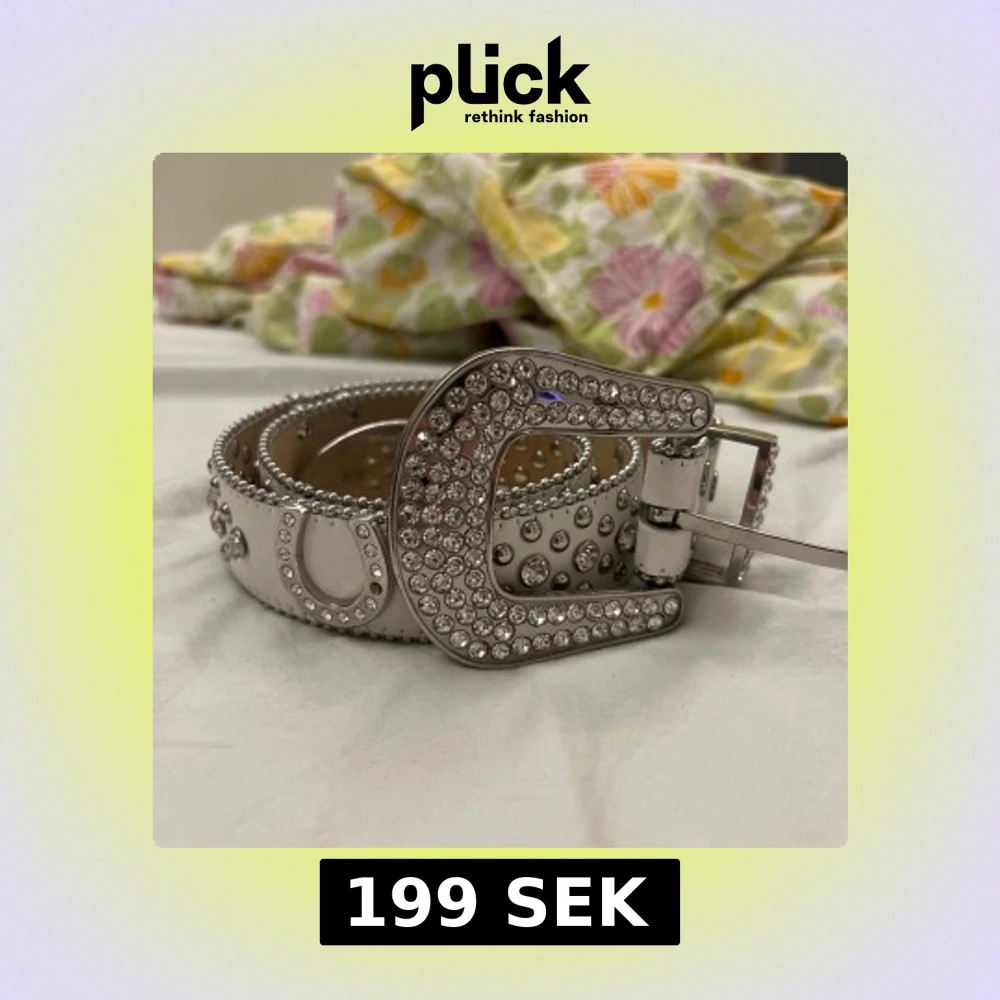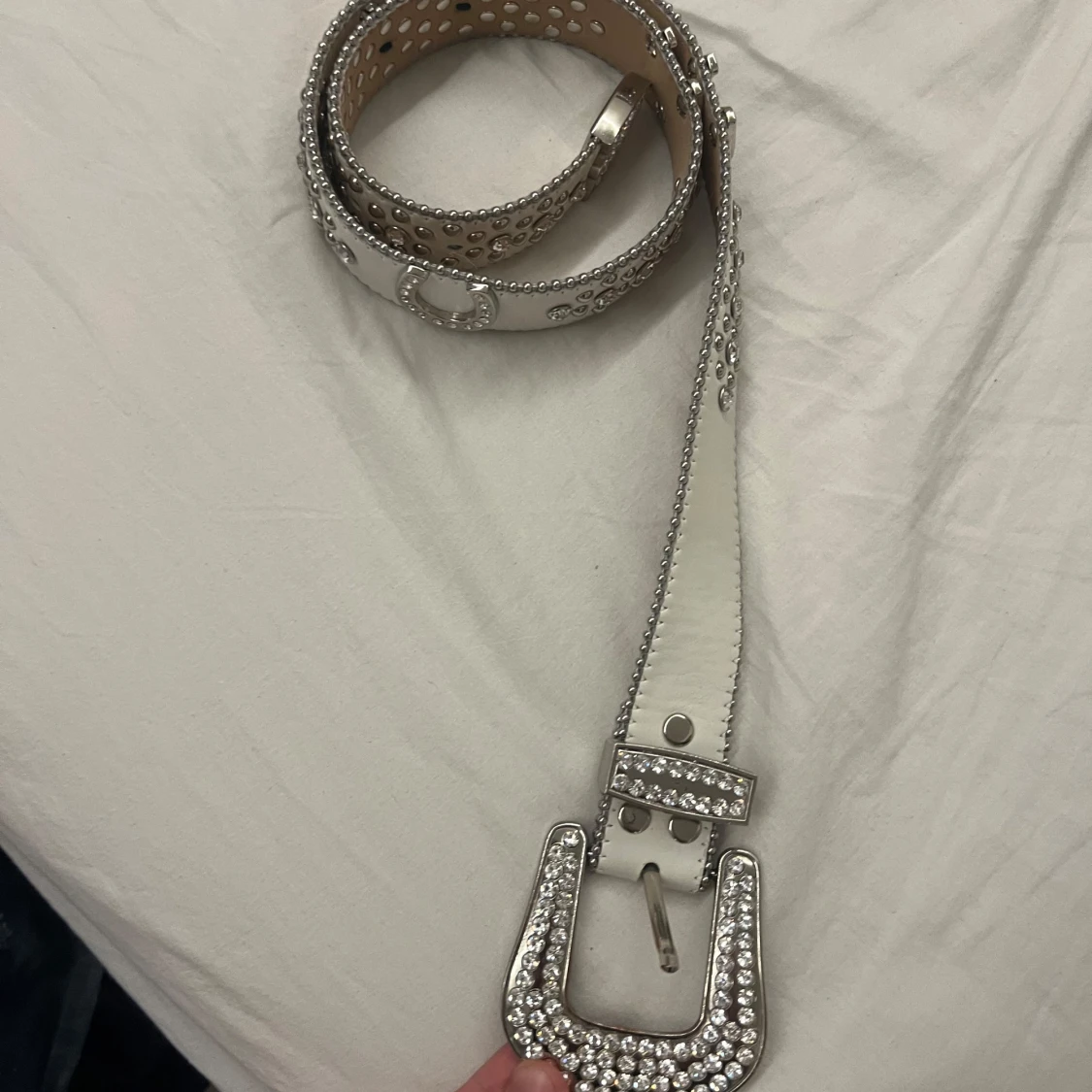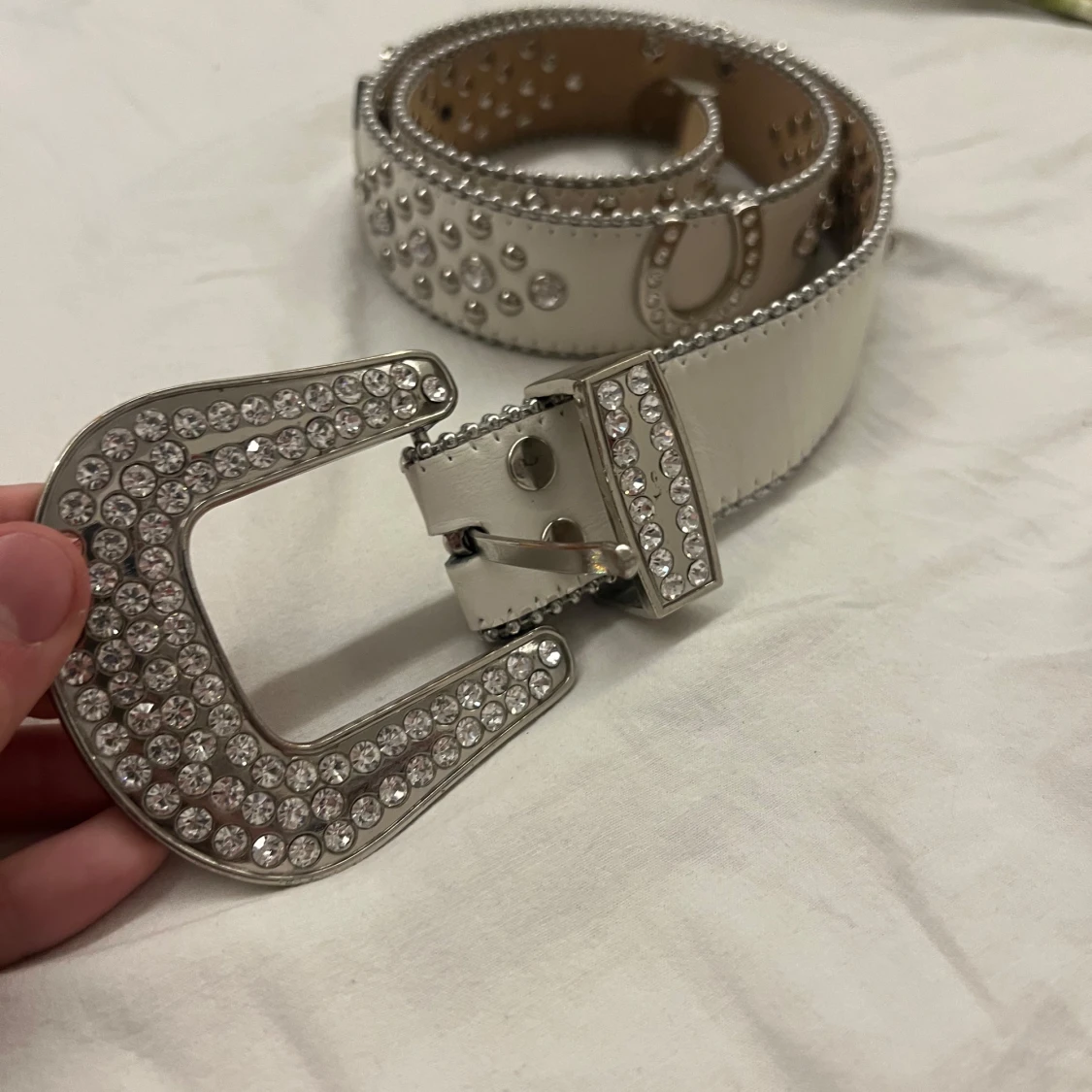 Snyggt vitt bälte med stora mängder glittrande strass på både spännet och längs hela bältet. Spännet är hästskoformat och bältet har silvriga detaljer och nitar. Perfekt för dig som vill sticka ut och addera lite extra bling till outfiten. 100CM 105 total