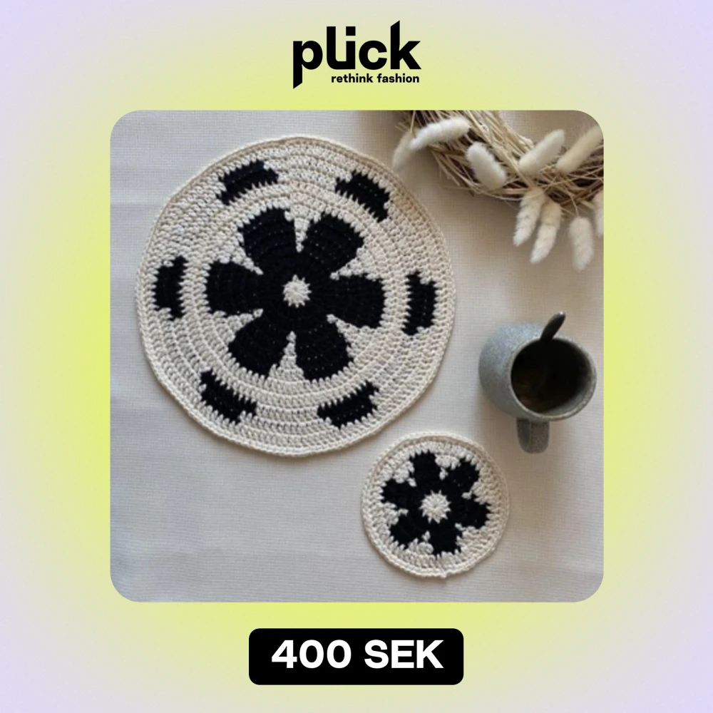 Jag gör handvirkade bords & glasunderlägg 🖤 Man får gärna välja egna färger! Bordsunderlägg: 27cm (diameter) & glasunderlägg: 13cm (diameter)