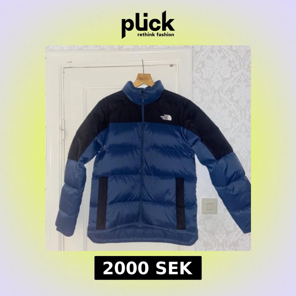 Säljer en blå och svart dunjacka från The North Face i storlek M. Jackan har hög krage, dragkedja framtill och två svarta fickor. Klassisk pufferstil med quiltad design och lång ärm, perfekt för kalla dagar. den är använd en gång köptes 17 november från butik alltså inprincip helt ny