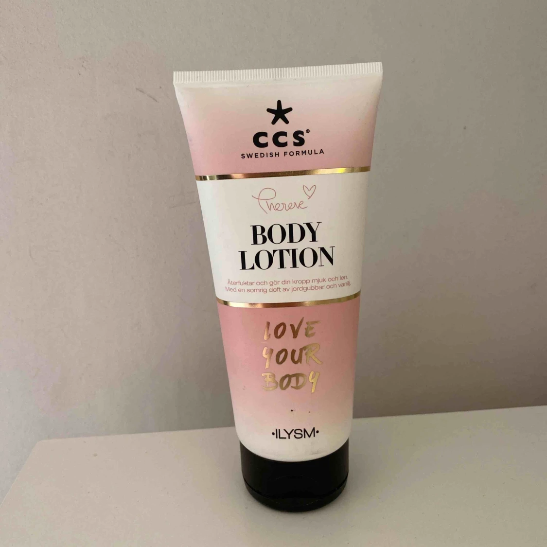 Bodylotion, endast öppnad men säljer pga att jag inte tål doften. Luktar jordgubb och vanilj.
