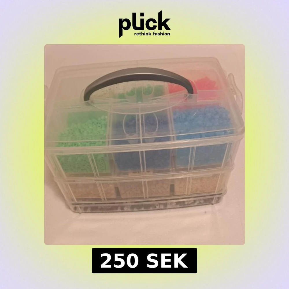 Låda från panduro värd 300kr utan pärlor i nyskick! 13 fack och 3 höjder, två våningar med 6 fack som går att lyfta ut 3 och 3 och en våning med ett stort fack. Våningarna går att ändra ordning på! En perfekt present för barnen👌🏼fylld med pärlor som INGÅR, gröna i tre nyanser, mörkblå och ljusblå, neon rosa, genomskinliga, vita samt pärlemor, bruna/beiga i 3 nyanser och i botten svart mellangrå och ljusgrå. Lådan är 23cm i bredd, 15,5 i höjd och 14,5 i djup, Hoppas det intresserar dig🩷