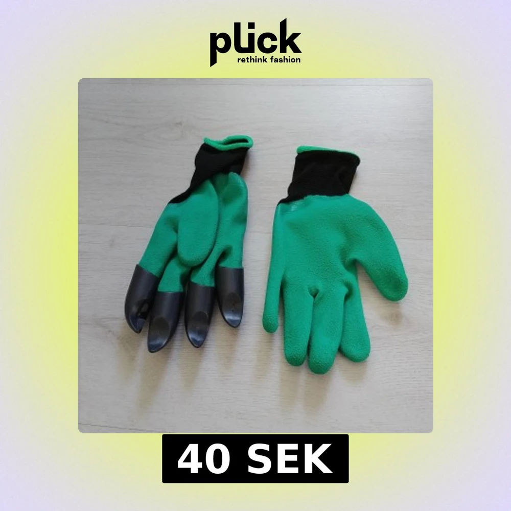 Gröna trädgårdshandskar med svarta klor på fingertopparna, perfekta för att gräva och plantera i trädgården. Handskarna har svart mudd och är tillverkade i slitstarkt material som ger bra grepp och skydd för händerna. Klorna bra vid grävning, krattning och plantering