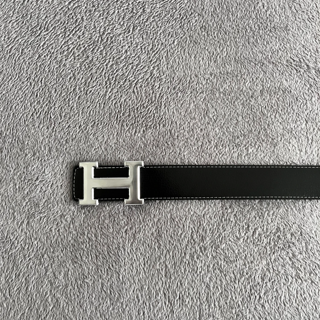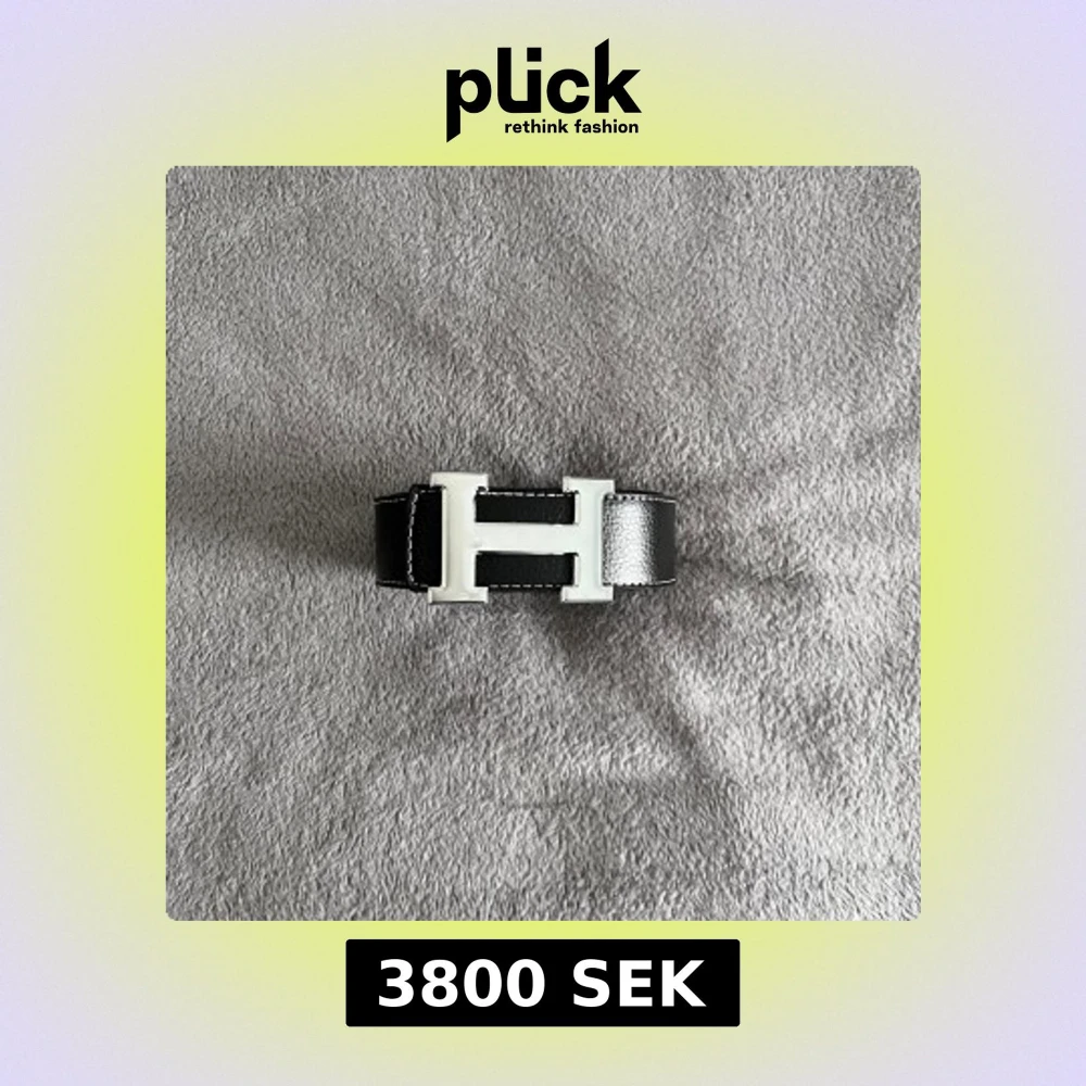 Säljer ett svart skärp från Hermès med klassiskt stort H-spänne i silverfärgad metall. Bältet är gjort i äkta skinn med vit kontrastsöm och har en stilren, tidlös design. Perfekt accessoar för att lyfta vilken outfit som helst.