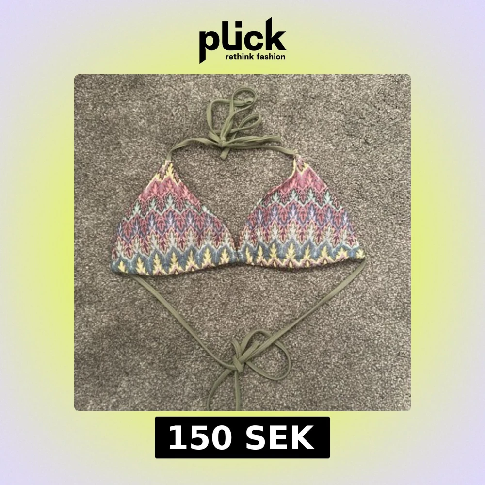 Säljer en snygg bikiniöverdel i trekantsmodell med knyt i nacken och ryggen. Mönstret är färgglatt i rosa, blått, gult och grönt med en bohemisk känsla. Perfekt för stranden eller poolen!
