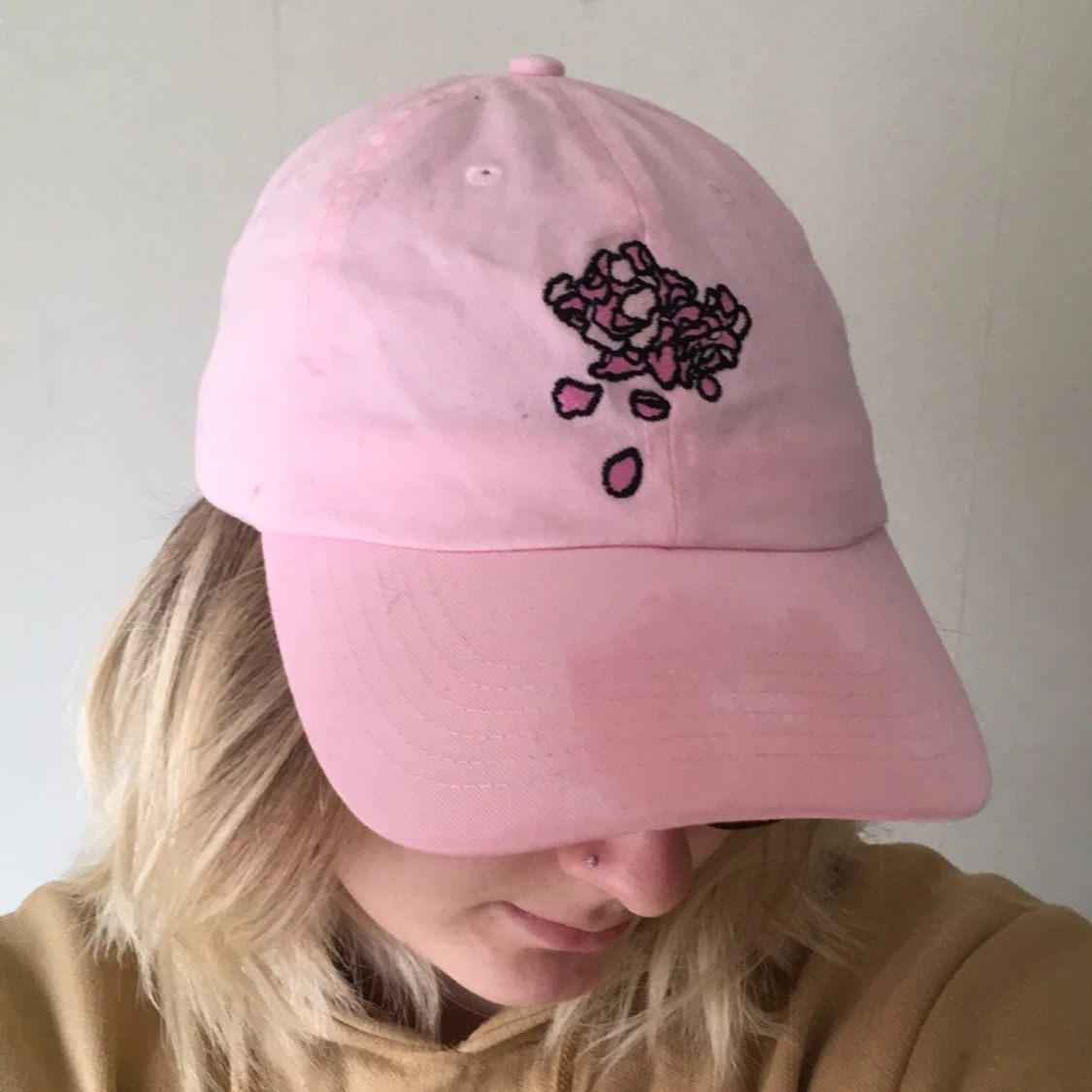 Troye Sivan keps i rosa. Det som ser ut att vara lite mörkar eller en "fläck" är bara vatten som jag råkade spilla. Det har torkat igen 😁