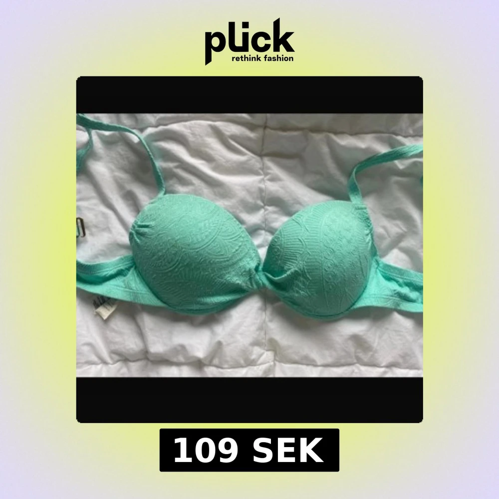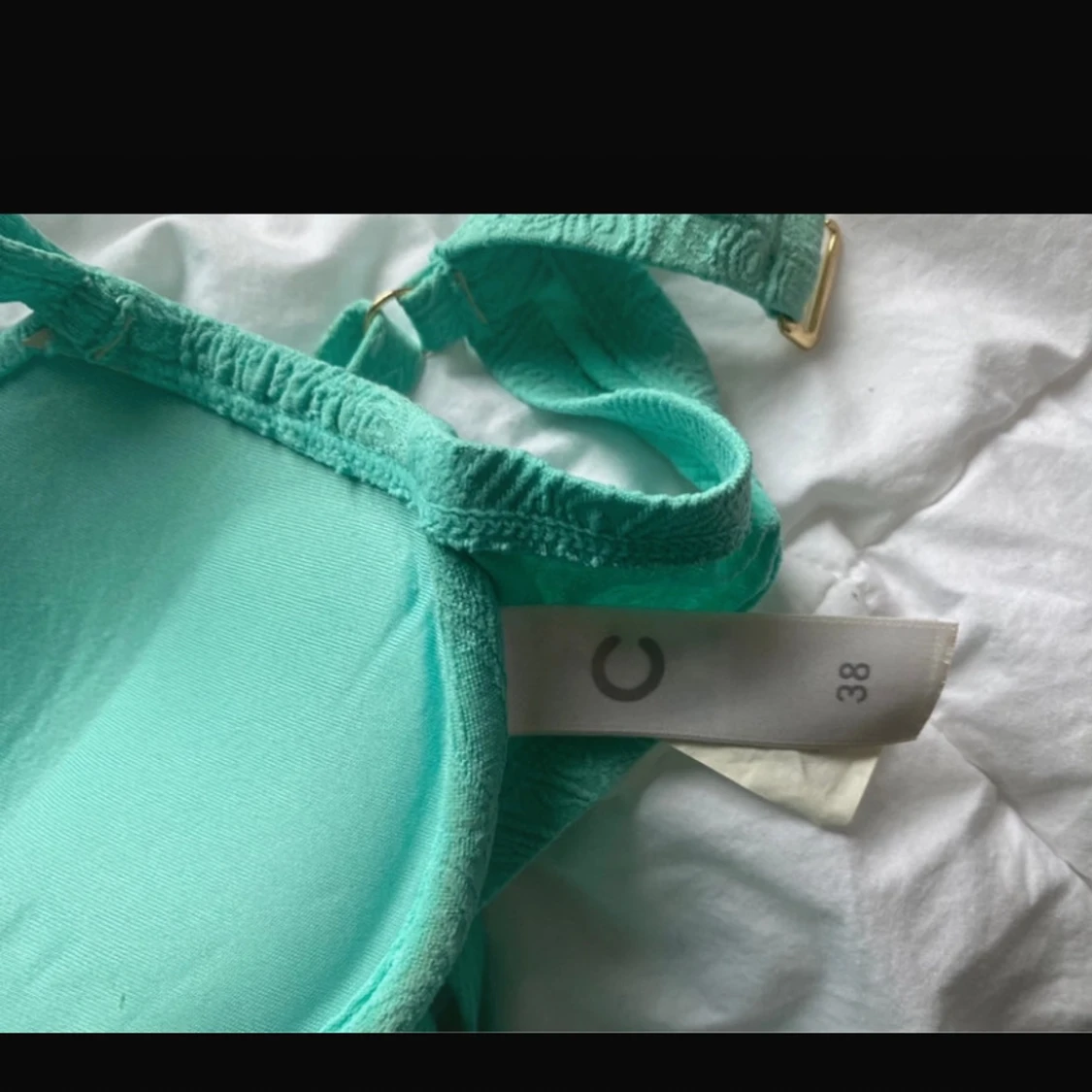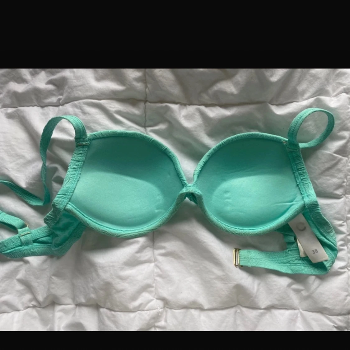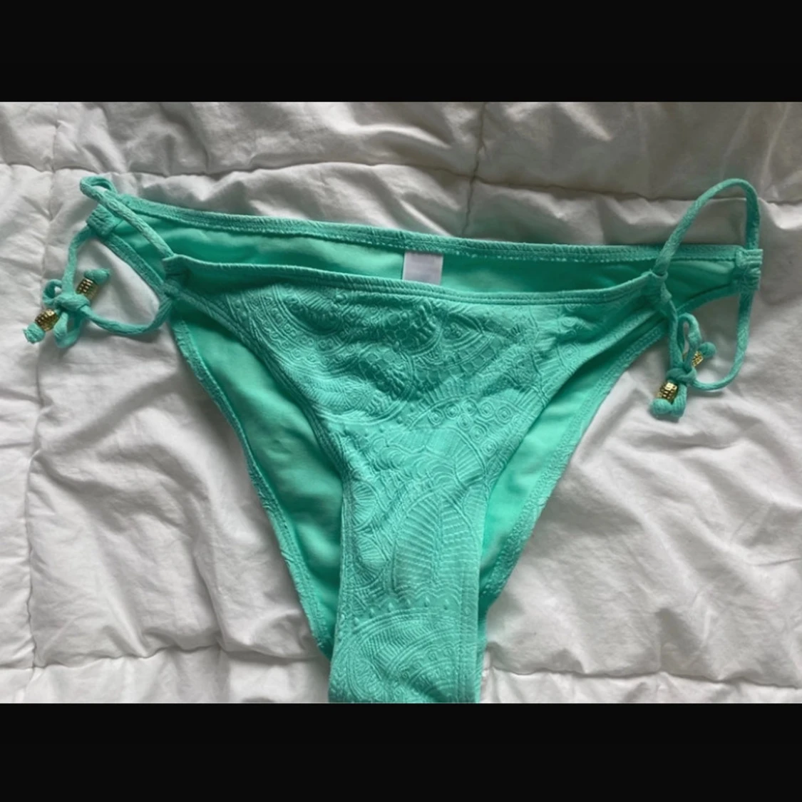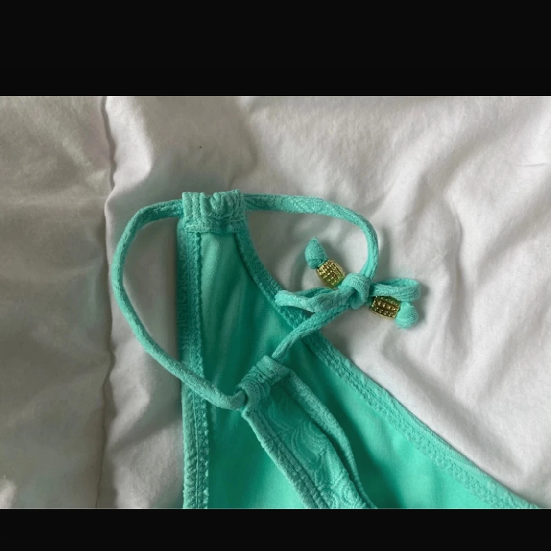 Säljer en turkos bikini med vadderad bygel-bh och matchande trosa. Båda delarna har ett snyggt strukturerat mönster och trosan har snörning i sidorna med guldiga detaljer. Köpt från secondhand men inte inte använt eftersom de passar inte mig. Bhn: storlek 38 , trosorna storlek 40 men kan justera banden om man vill ha mindre eller större.