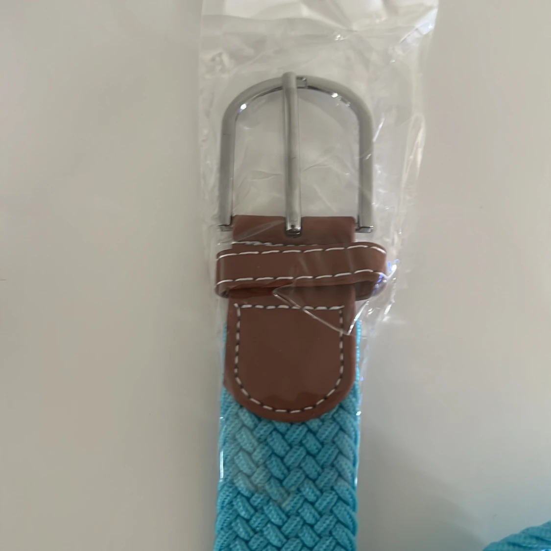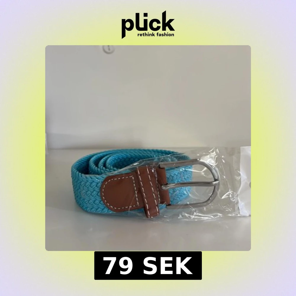 Säljer ett turkost flätat bälte med bruna skinn-detaljer och silverspänne. Perfekt accessoar för att ge din outfit lite extra färg. Bältet har en klassisk design med kontrastsömmar på skinnet.
