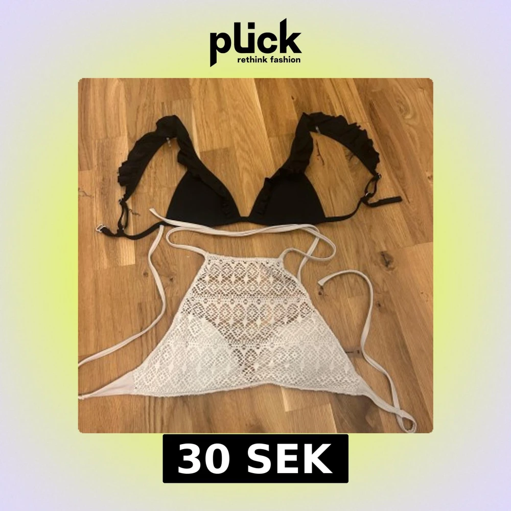 Två bikini överdelar säljes tillsammans, den vita från bikbok storlek xs. Den svarta från hm storlek 34😊