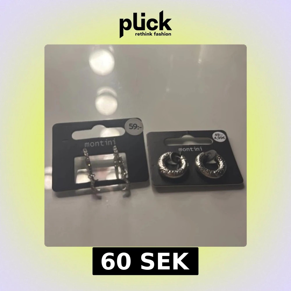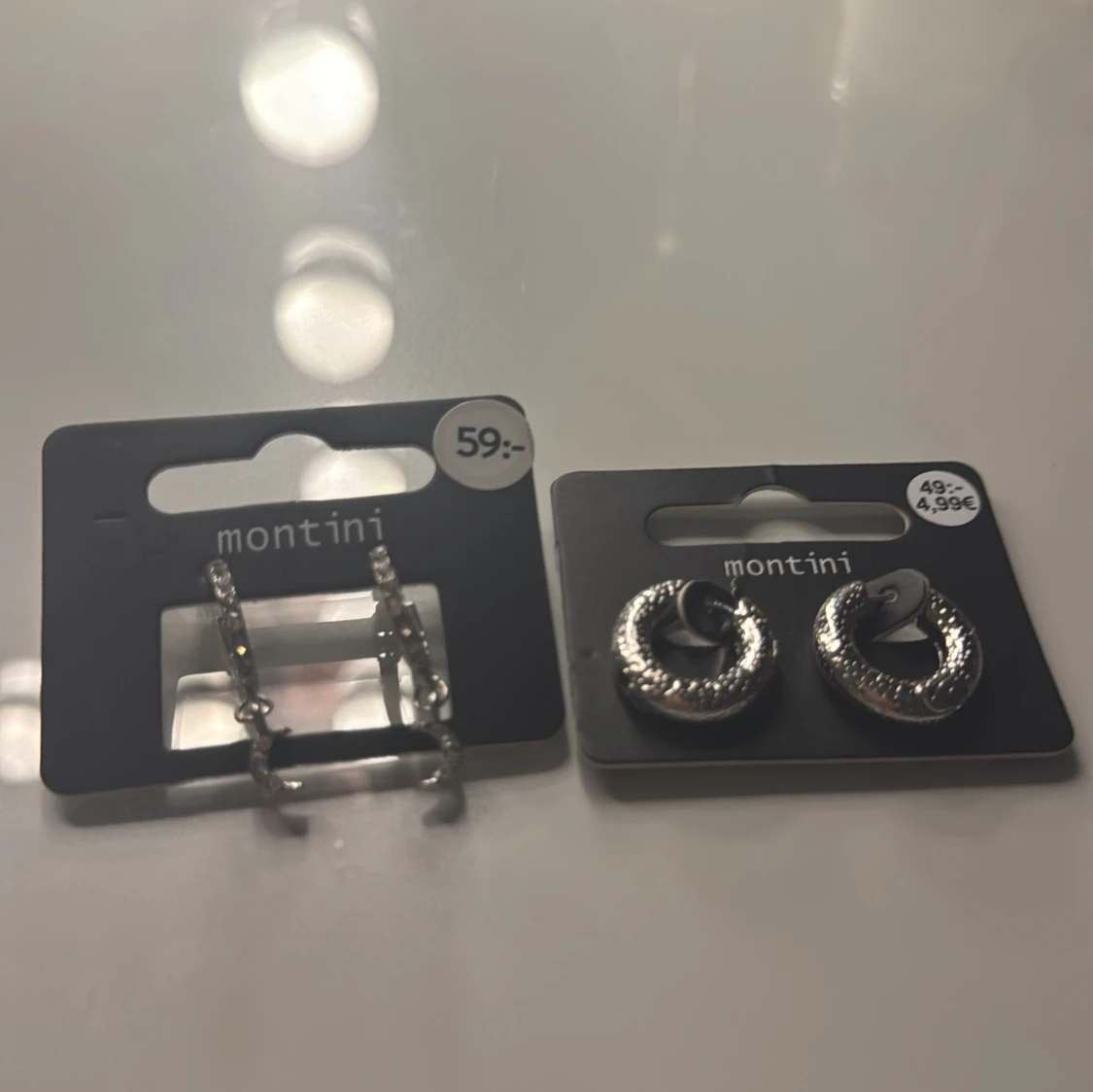 Säljer två par snygga örhängen från Montini. Ena paret är små hoops med glittriga stenar, det andra är chunky ringar med textur. Perfekt för att lyfta din stil med lite extra bling. Båda är i silverfärg och passar till många looks.