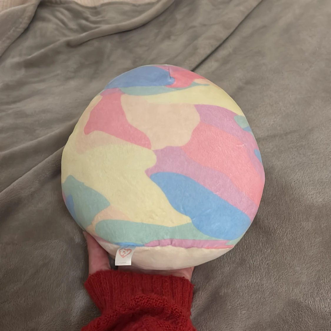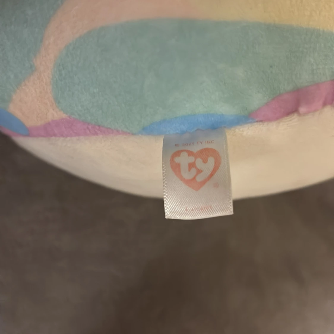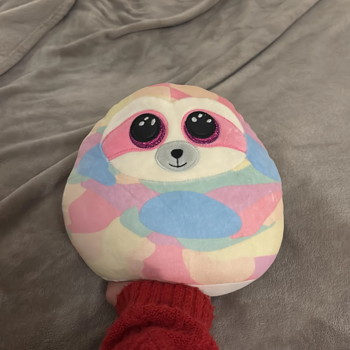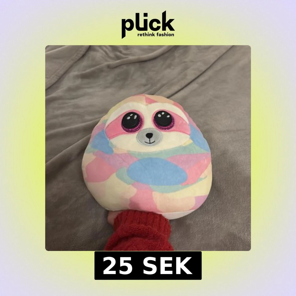 Supermjuk och färgglad Ty kudde i form av en söt sengångare med stora glittriga ögon. Pastellfärger i rosa, blått, gult och lila. Perfekt skick, inga synliga defekter eller slitage. Mysig som prydnad eller kramkudde i sängen eller soffan.