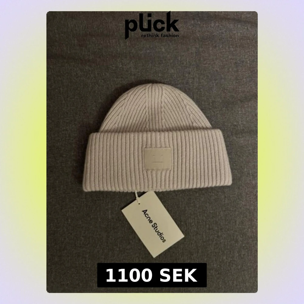 Snygg beige mössa från Acne Studios med ribbstickad design och uppvikt kant. 100% Ull. Butikpris: 1599 kr