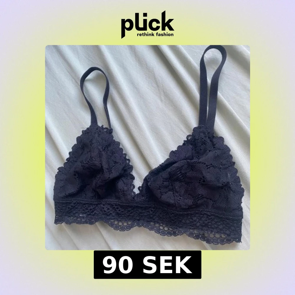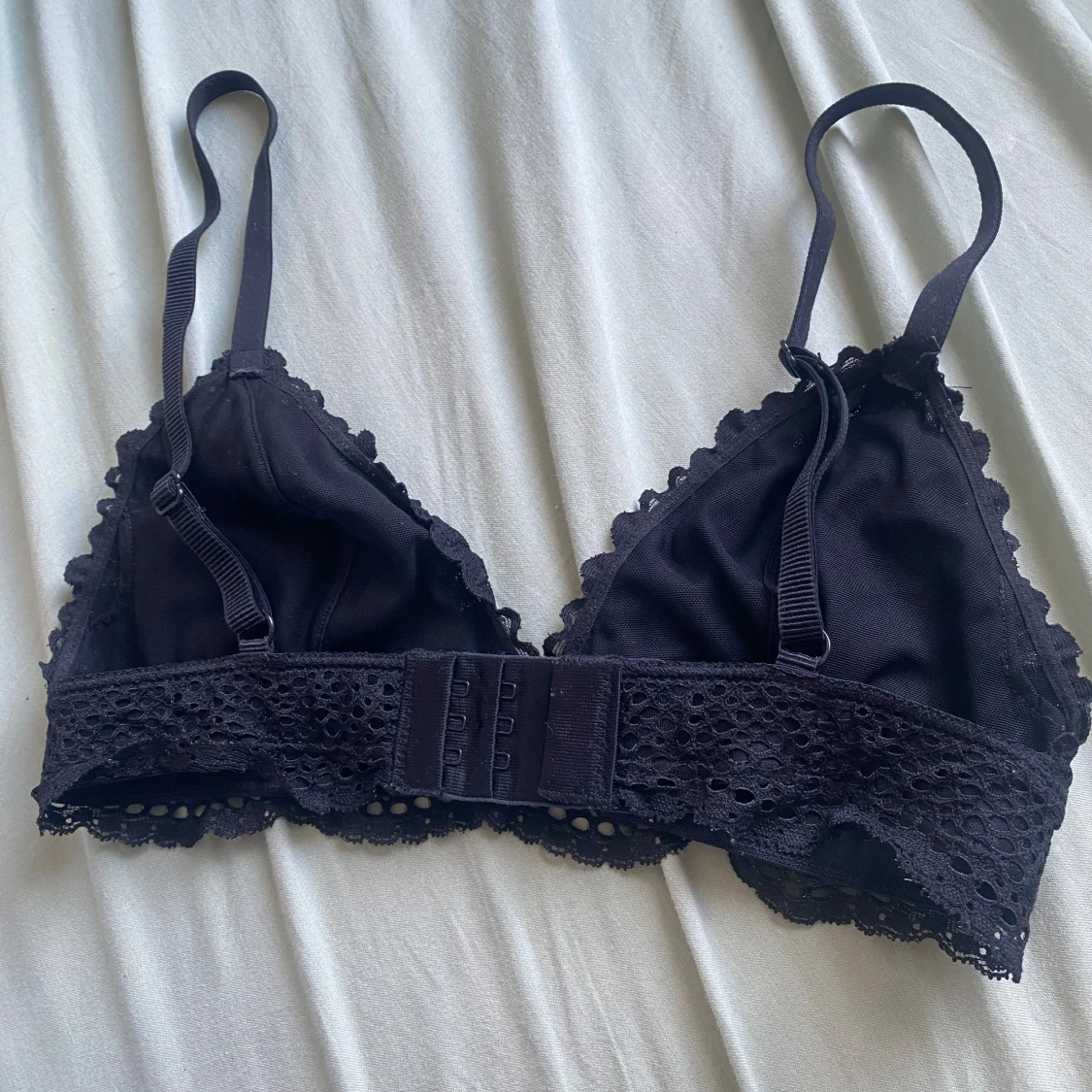 Supersöt svart bralette i spets med tunna, justerbara axelband och bred spetskant nedtill. Triangelkupor med blommigt spetsmönster och hakknäppning bak.