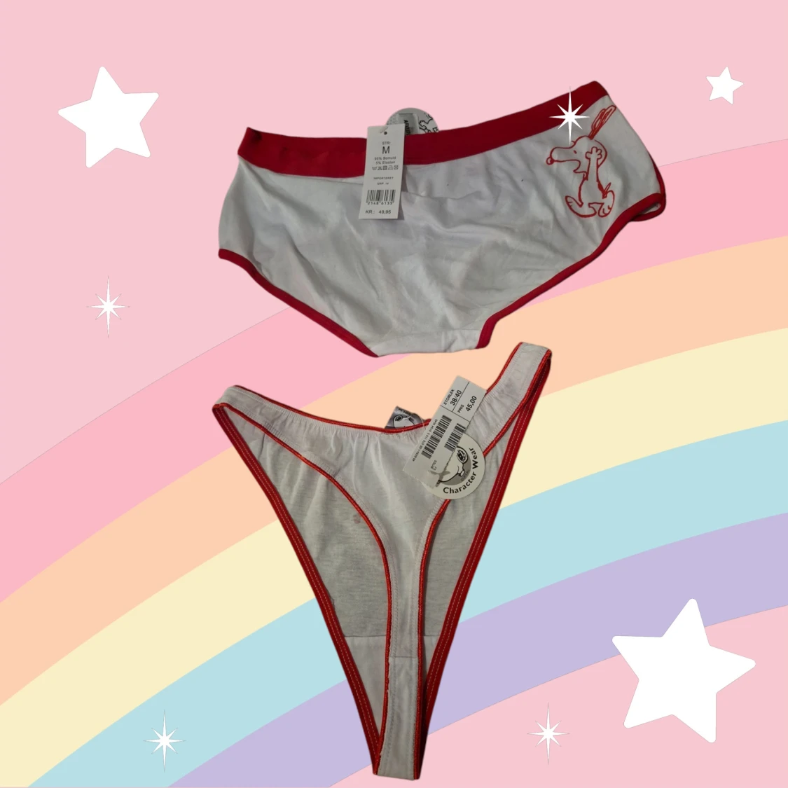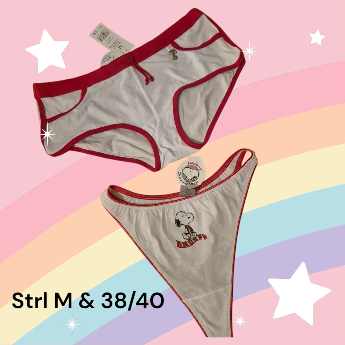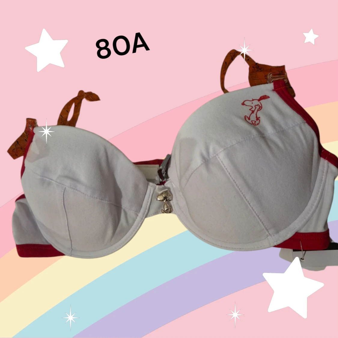 Supergulligt underklädesset. Först en bh med Snoopy eller Snobben på. Den är vit med röda detaljer. BH:n har uttagbara kuddar i kuporna och orange'a halvgenomskinliga axelband som går att ta av. Det ingår också två par trosor - ett par hipsters och ett par stringtrosor. Allt är nytt med orginaletiketten kvar. Kommer från konkurslager. Finns många storlekar, fråga om du inte hittar. Rabatt om du köper flera. Storlekar: BH 80A, Hipster M, String 38/40.