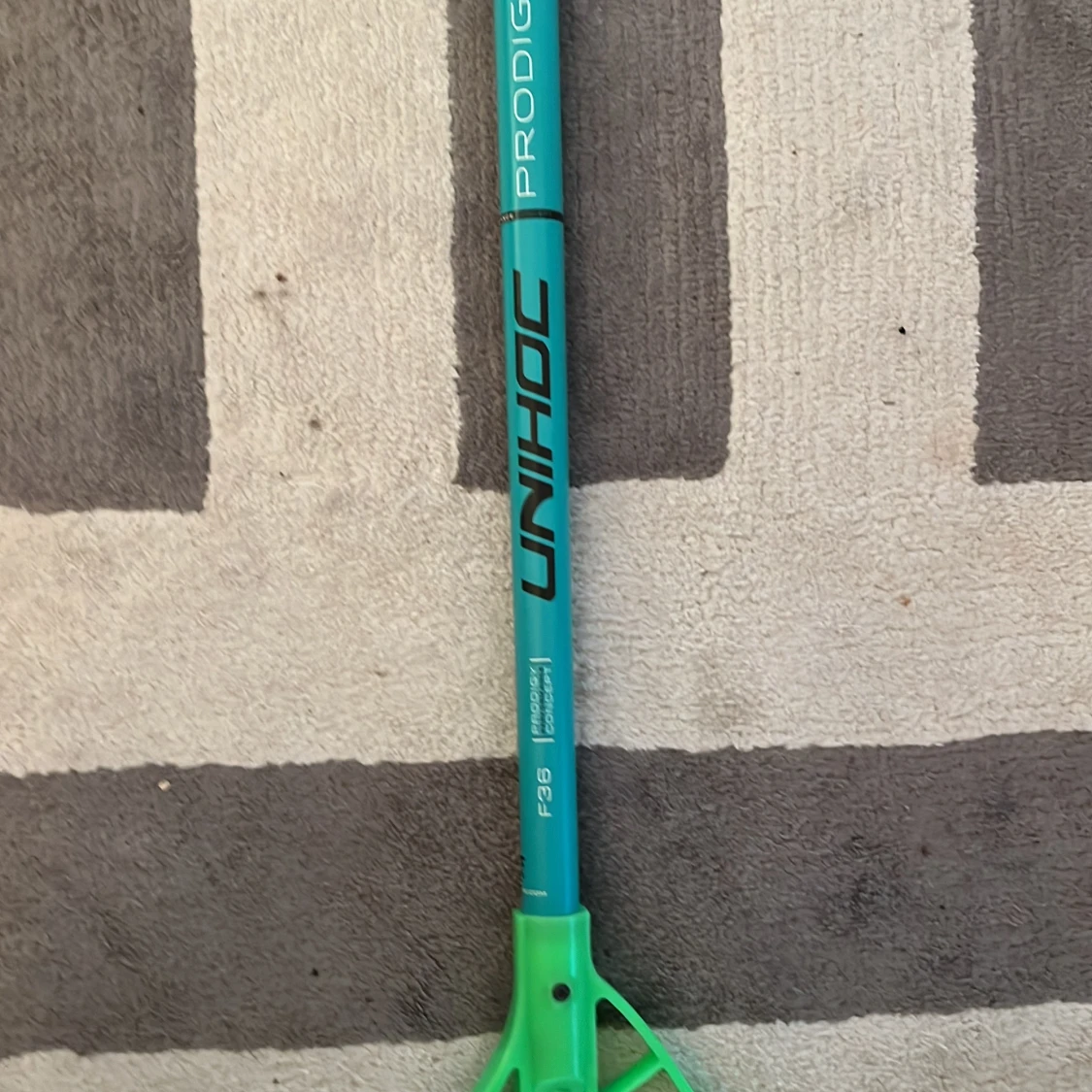 Unihoc Prodigy F36 innebandyklubba i fint skick. Lätt och tålig klubba med grön blad och turkos skaft, perfekt för både nybörjare och erfarna spelare. Greppet är fräscht och bladet är rakt utan synliga skador. Klubbans skick är mycket bra.