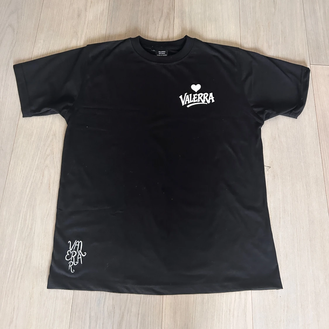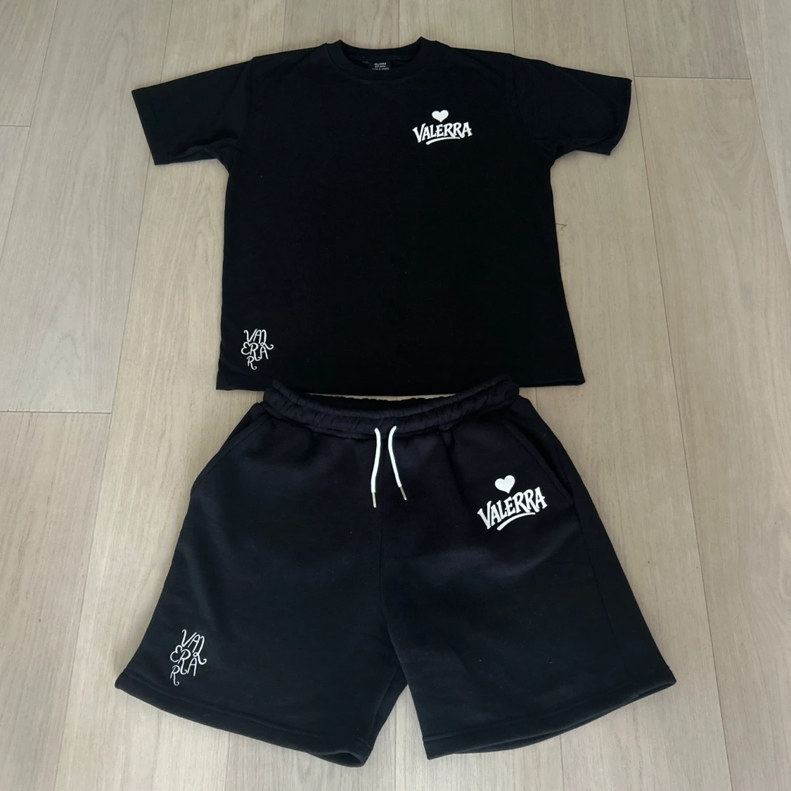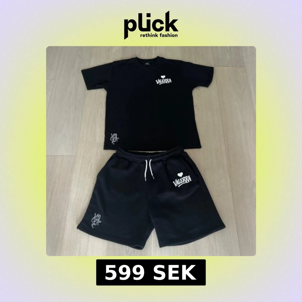 sommarset från Valerra, bestående av matchande T-shirt och shorts. Setet har en minimalistisk design med en broderad logga och en större tryckt logga som ger en modern touch. Materialet är av premiumkvalitet – huvudsakligen bomull – vilket gör det både bekvämt och perfekt för varma dagar. Det här setet är en del av en exklusiv drop och kommer med största sannolikhet inte att släppas igen i år. Perfekt för dig som gillar stilrena, street-inspirerade plagg med hög kvalitet.