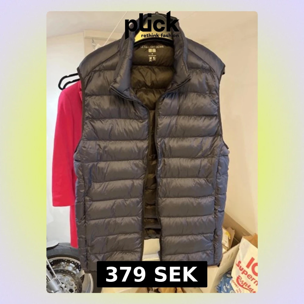 Snygg mörkblå dunväst från Uniqlo med lätt och smidig design. Västen har ståkrage, dragkedja framtill och quiltad yta med horisontella sömmar. Perfekt att slänga över en hoodie eller tröja för extra värme utan att bli för tung. Använd 3 gånger så super fint skick