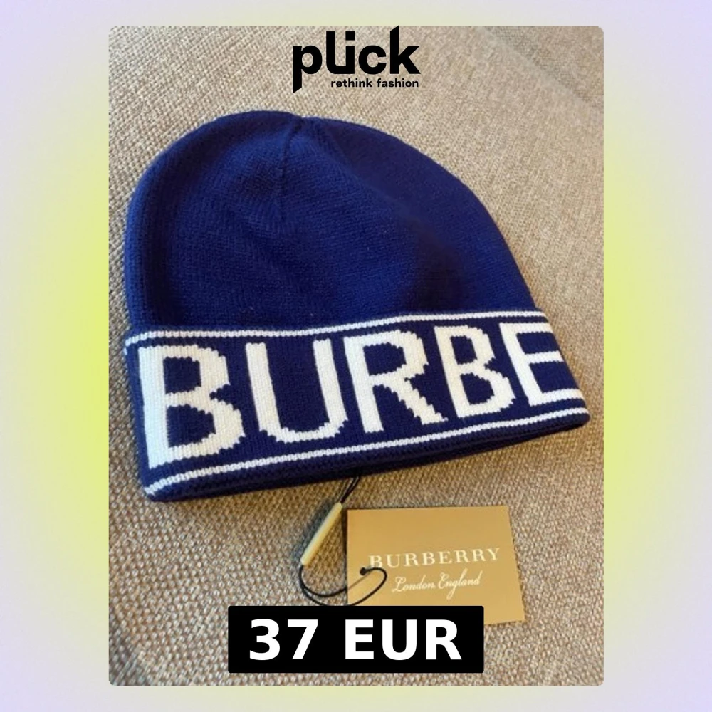 Snygg blå stickad mössa från Burberry med vit logotyp i breda bokstäver runt kanten. Mössan har en klassisk form och är tillverkad i mjukt material som känns skönt mot huvudet. Perfekt för dig som vill ha en stilren accessoar med lyxig känsla.