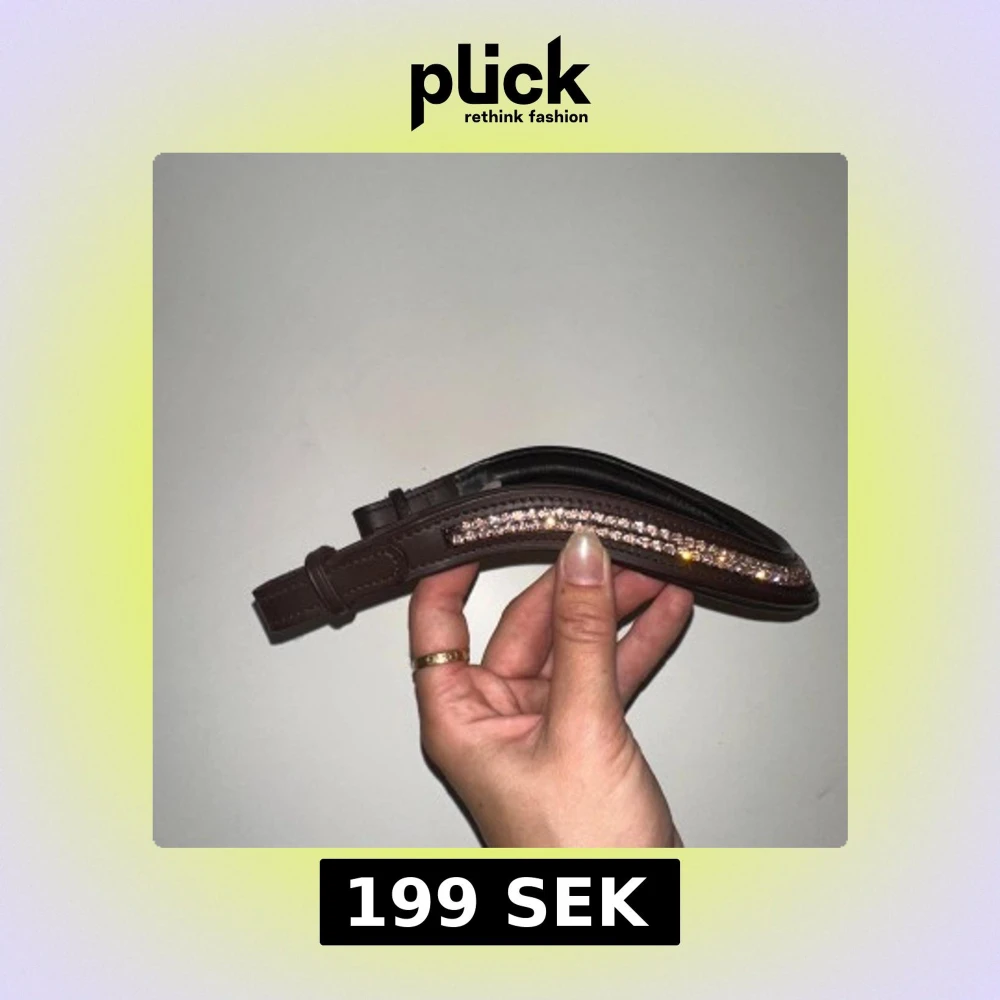Mörkbrunt pannband i skinn med glittriga stenar i rosé. Går att knäppa på superenkelt med kardborrefästen i sidorna. Helt oanvänt! Storlek Full.