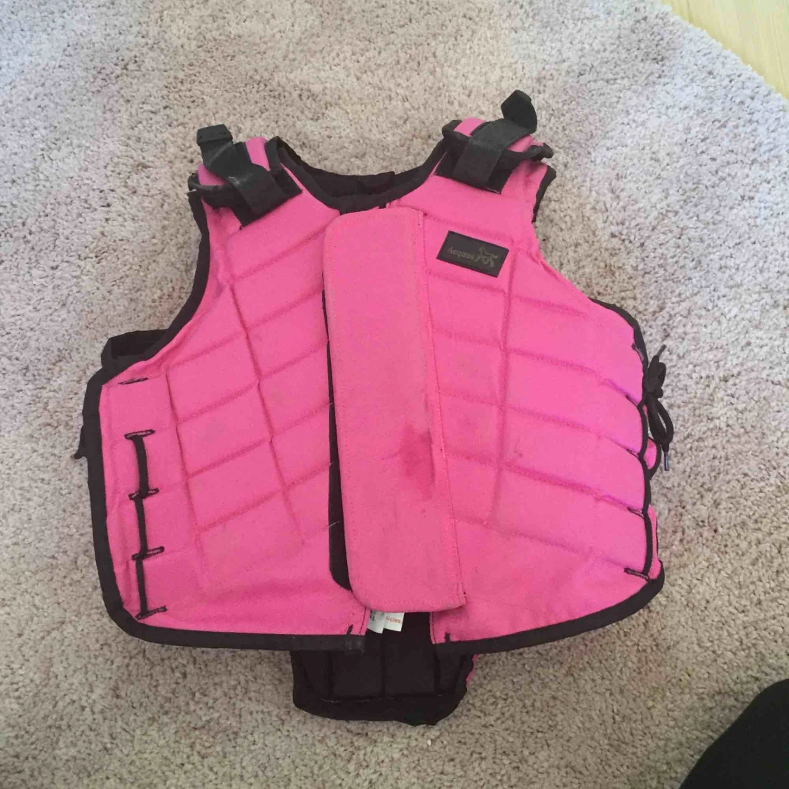 Detta är en nästan ny, tuggummi råsa ridväst😃Den är från 7/8-11år😉Den har snören på sidorna och spännen längst upp. En dragkedja som man kan stänga västen med eller om man vill knäppa den