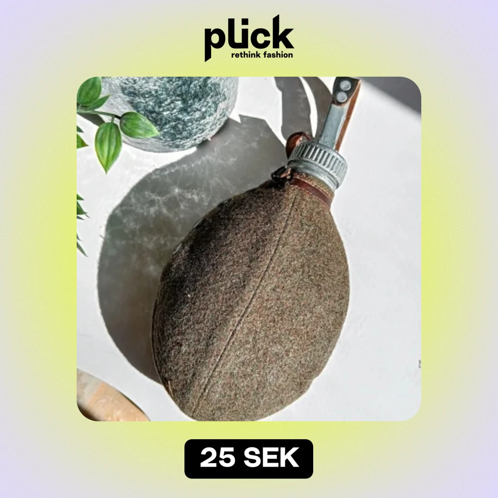 Vattenflaska köpt från överskottsbolaget i Göteborg (second hand för militär utrustning). Flaska i stål med hänge och ett fodral i ull