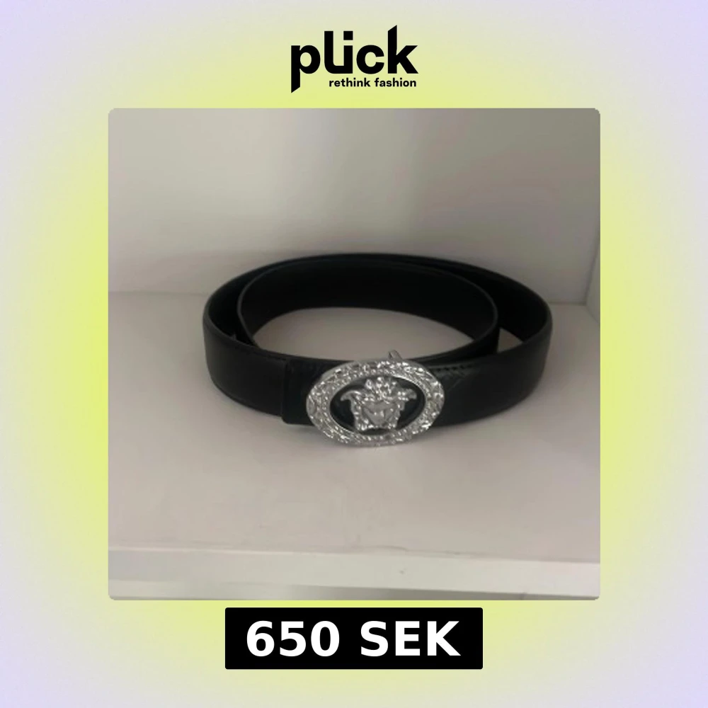 Snyggt svart bälte från Versace i skinn med en stor, oval silverspänne prydd med Medusa-huvud och glittrande stenar runtom. Bältet har diskret mönsterprägling längs remmen som ger extra lyxig känsla. Perfekt accessoar för att lyfta din outfit.