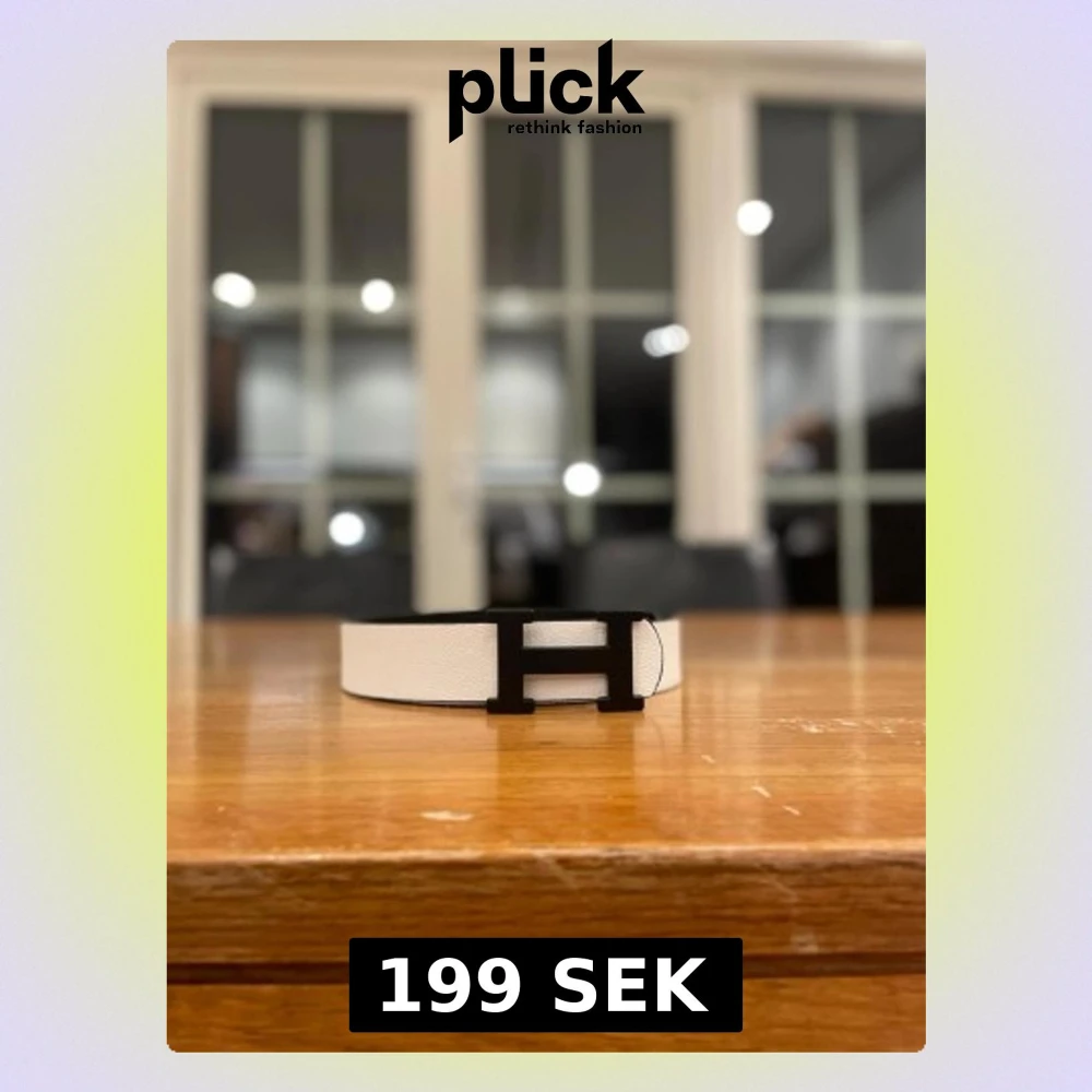 Säljer en stilren väst i svart och vitt med ett stort H-format spänne framtill. Västen är tillverkad i präglat skinn och har en klassisk, rak form. Perfekt för dig som gillar minimalistisk design och vill sticka ut med en snygg detalj.