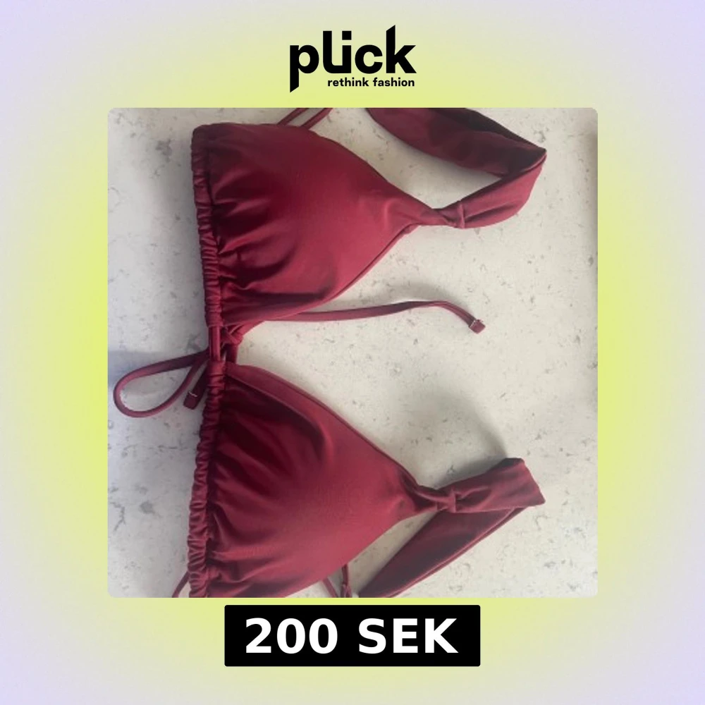 Säljer en vinröd bikini med trekantsöverdel och knyt i ryggen. Underdelen har breda band i sidorna och en klassisk tanga-modell. Perfekt för stranden eller poolen!