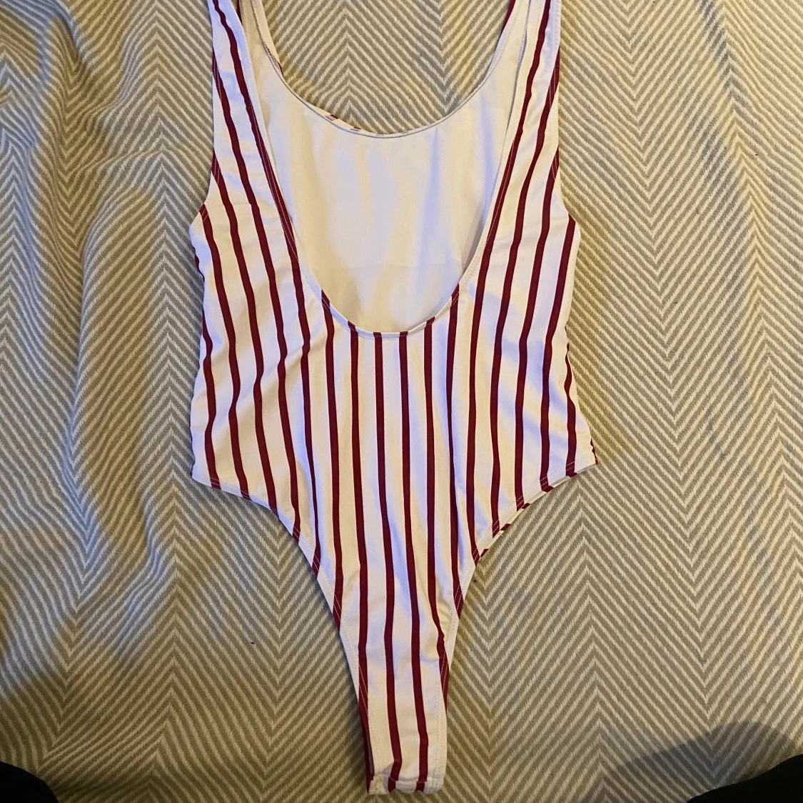 Jättefin baddräkt i vit/vinröd randig med öppen rygg och hög skurning upp på höfterna. Från shein i storlek M❤️
