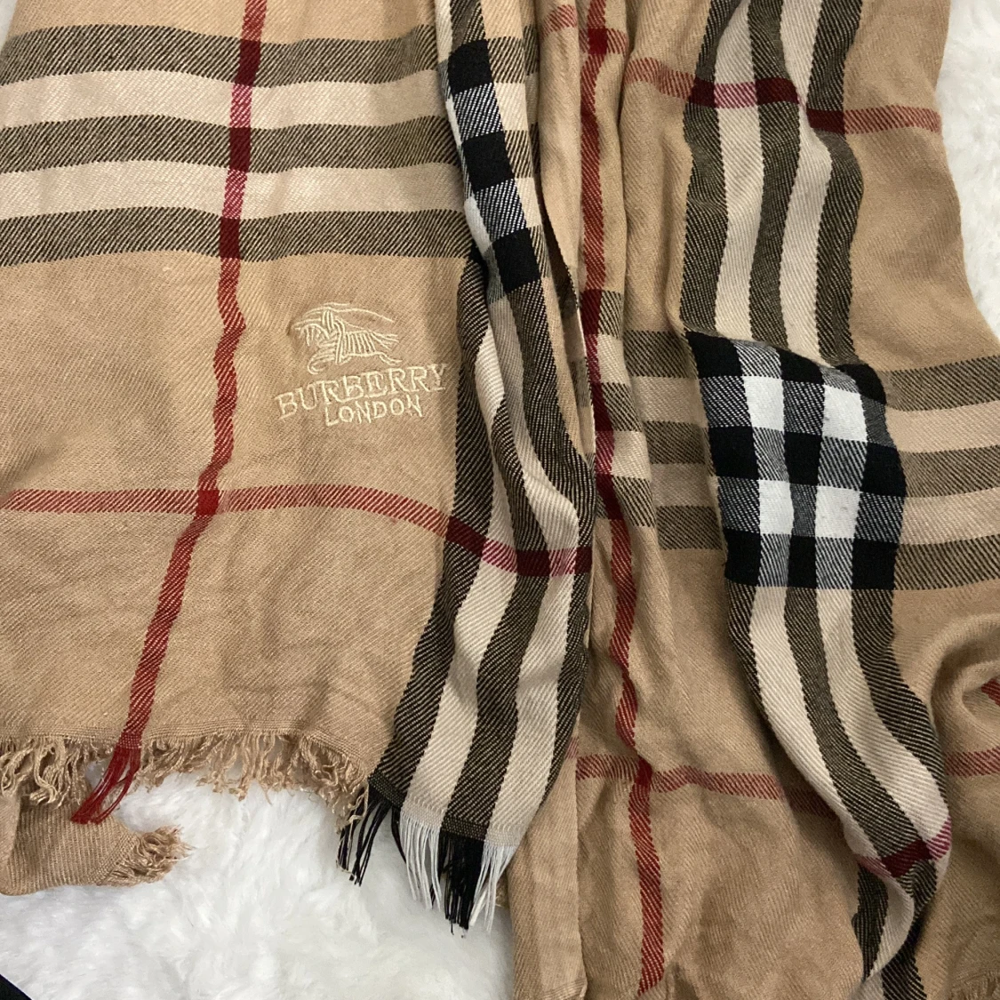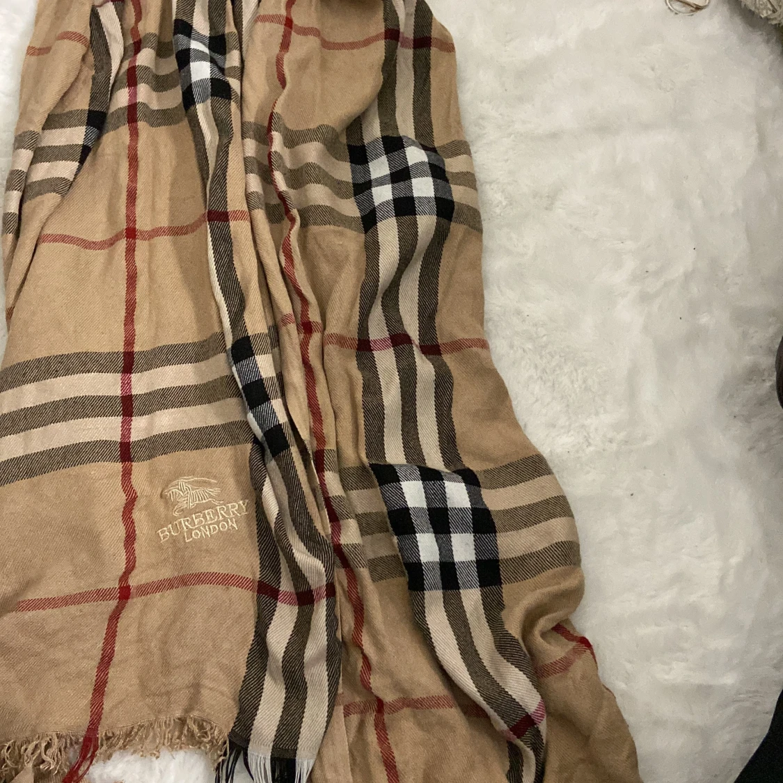 Säljer en klassisk beige rutig halsduk. Den har det ikoniska rutmönstret i svart, röd och vit. Perfekt för att hålla sig varm och stilren under kyliga dagar. Halsduken är i bra skick och passar perfekt till höst- och vintergarderoben.