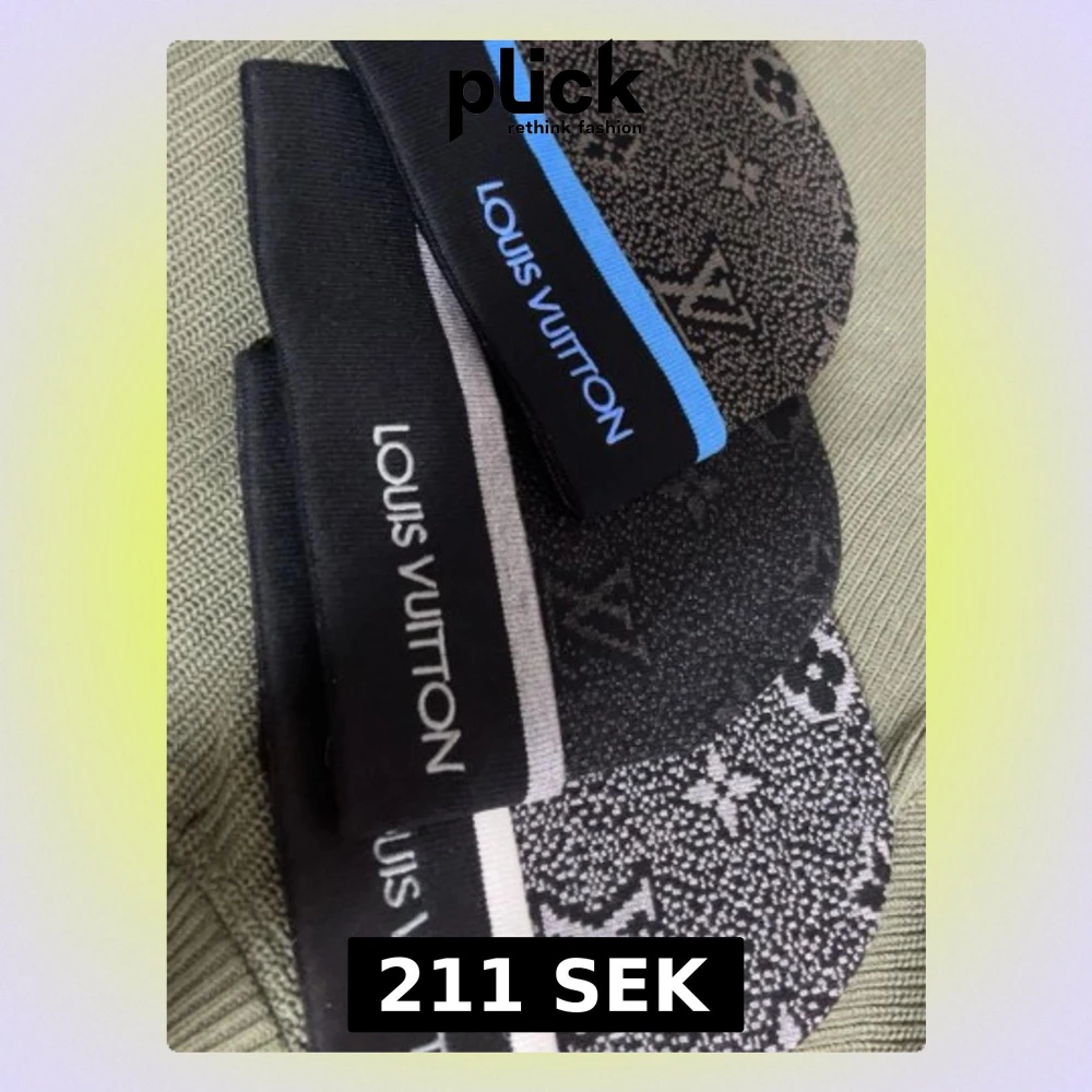 Säljer en svart och grå väst mössa med klassiskt monogrammönster och kontrasterande kantband i blått.