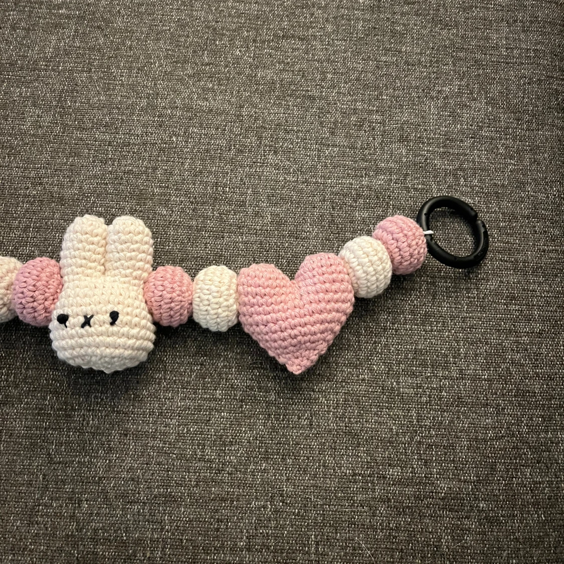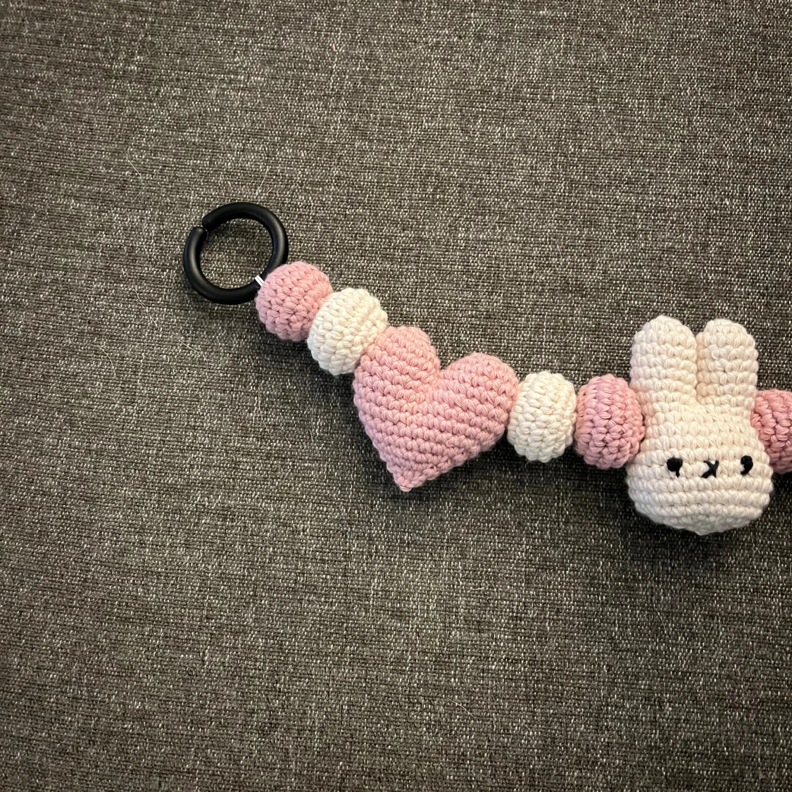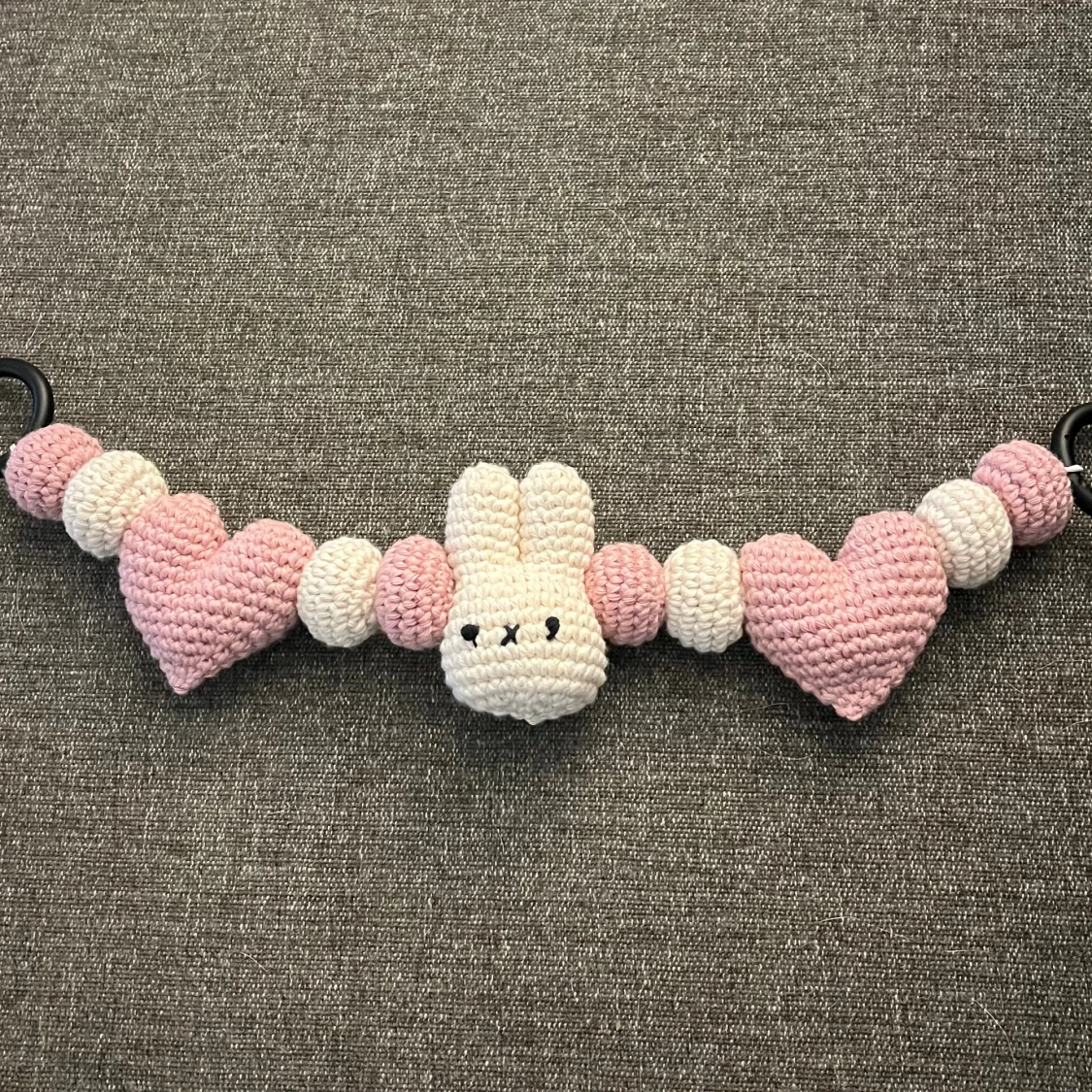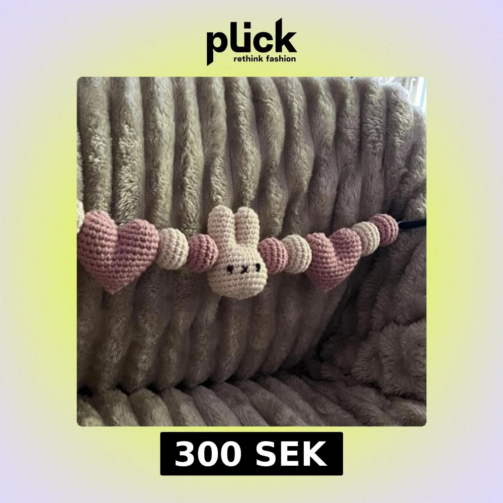 Virkad av mig. Med hjärtan, bollar och figuren Miffy. Virkad i 100% bomull🩷Perfekt som present till tex babyshower